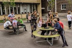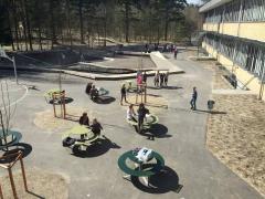新設(shè)計制作的桌椅套裝,自帶“咖啡館氛圍”,吸引著高年級學(xué)生使用,坐在這里可以觀看運(yùn)動場和滑板場的比賽?!皯敉忾L廊”為戶外繪畫、游戲、授課等活動提供了最佳的設(shè)施。蹦床和環(huán)形秋千最受女生喜愛,秘密樹屋是最好的玩捉迷藏的空間。