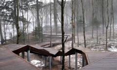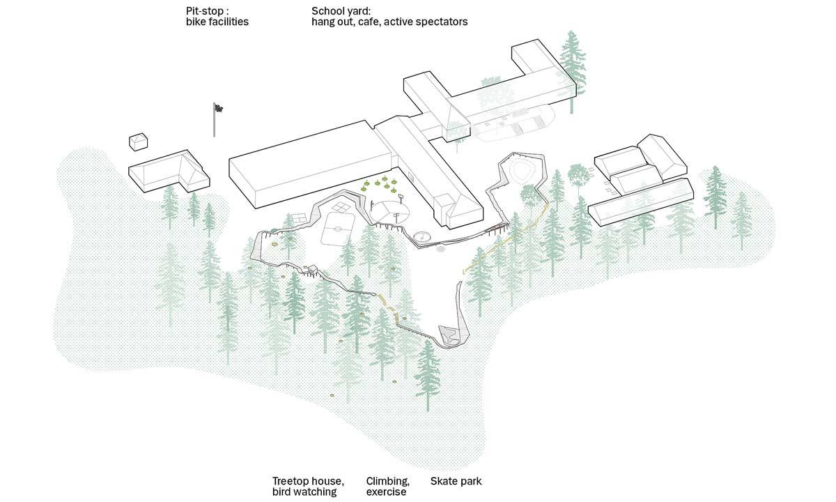 我們在校園和鄰近的森林設(shè)計了一套環(huán)形的木質(zhì)游樂空間,讓學(xué)生可以不停的奔跑、玩耍,游樂設(shè)施包括觀景臺、平衡木、爬梯、樹屋等,緊挨著校園滑板場、運(yùn)動場、咖啡休息區(qū)等其它活動空間的同時,又貫穿校園和森林。學(xué)生可以按照路線完成從學(xué)校 - 森林 - 學(xué)校的活動路徑。