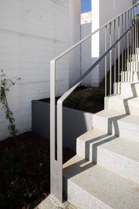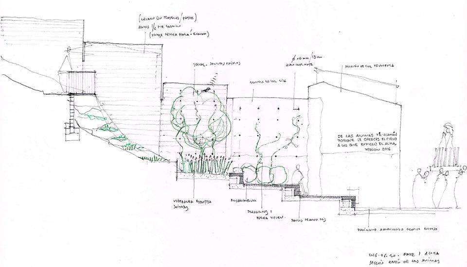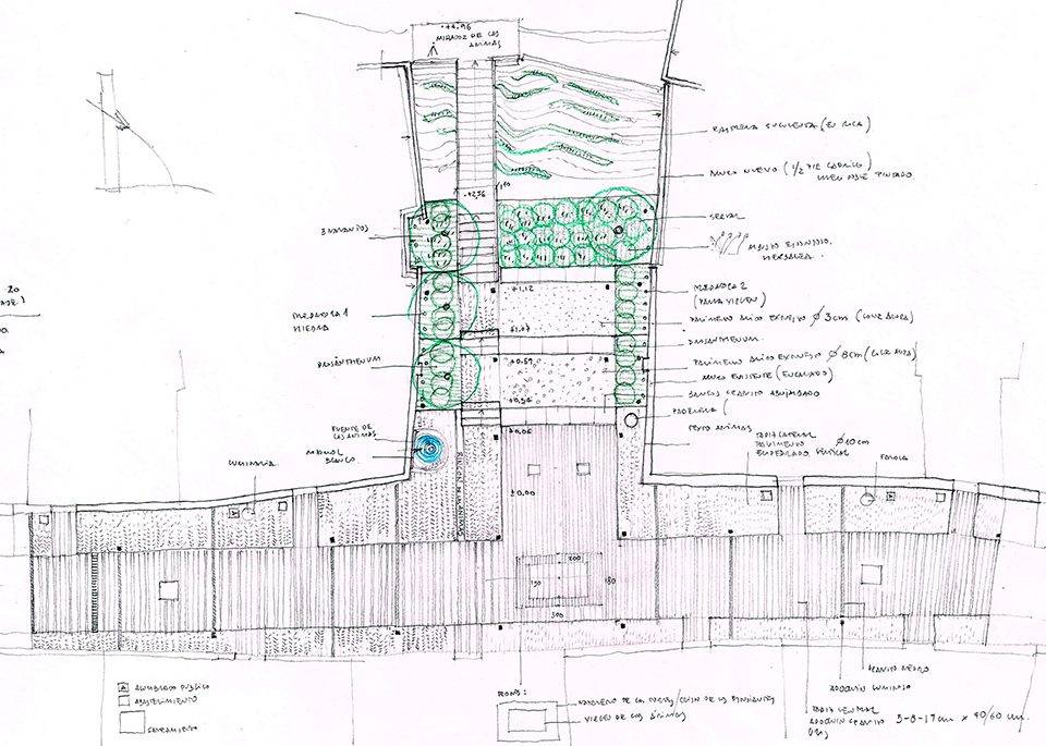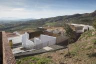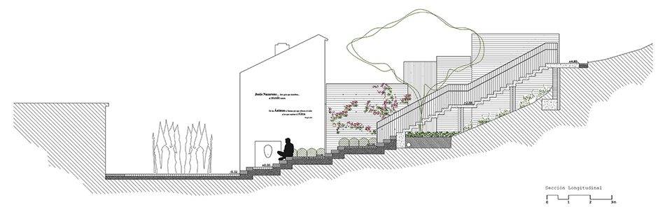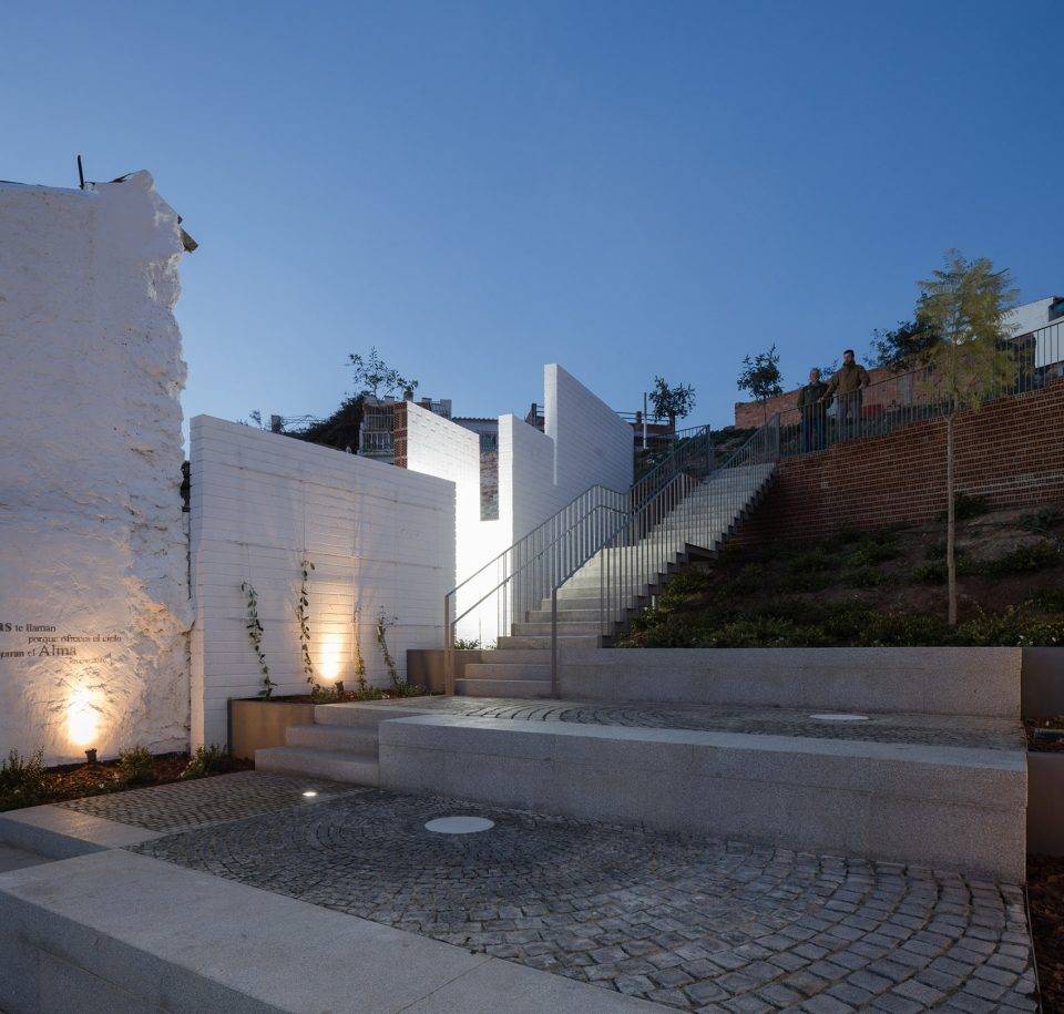 場(chǎng)地中的紋理、色彩、芳香、文字與人行道反映并突顯了其原有的歷史特征,同時(shí)將居民與游客聚集在一起。墻上的文字提到了尋找座天使的奇妙經(jīng)歷。“靈魂之泉”(pilar de las ánimas)則從白色的石壁中緩緩流出。場(chǎng)地中的斜坡被打造為石制平臺(tái),芳香的植物環(huán)繞在其間。平臺(tái)上方的樓梯連接著觀景平臺(tái),能夠俯瞰到瓜達(dá)洛塞河谷的美景。