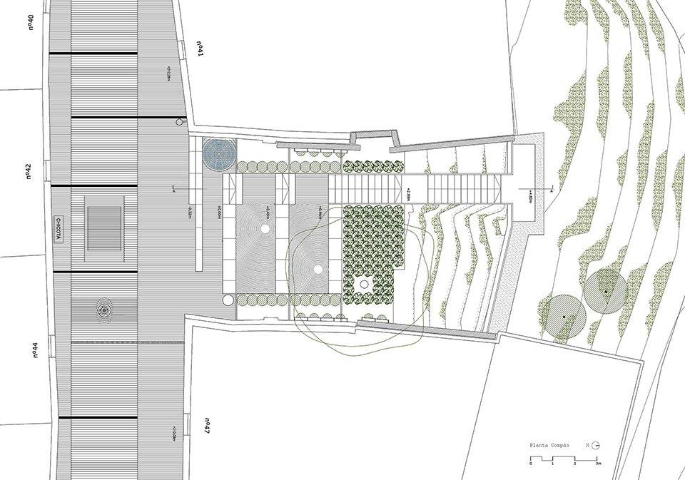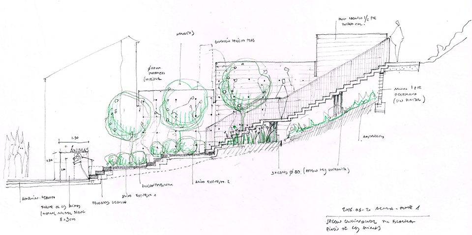 這座小廣場(chǎng)介于兩座住宅之間,原本是一處被棄置的場(chǎng)地,如今將被用作鄰近教堂的戶外休息區(qū)域(compás)。廣場(chǎng)的名字(Compás de las ánimas y del Nazareno)來(lái)源于城堡教堂中的宗教人物:靈魂圣女(Virgen de las ánimas)和耶穌納薩雷諾(Jesús Nazareno de las Torres)。在每個(gè)復(fù)活節(jié)的神圣星期五,這里都會(huì)舉辦他們的游行,屆時(shí)整個(gè)廣場(chǎng)便會(huì)成為熱鬧的看臺(tái)。