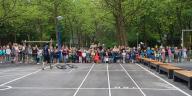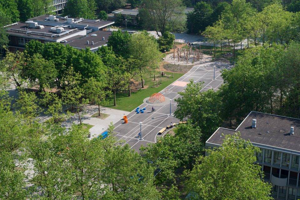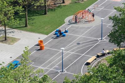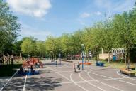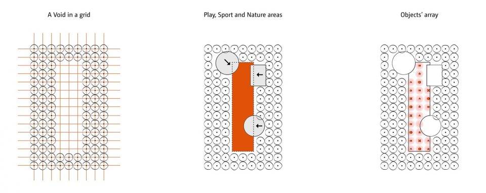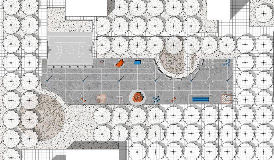 樸素單調(diào)的社區(qū)空間被這個新的游樂設(shè)施打破。為社區(qū)注入活力的同時延續(xù)了 Van Gool 的設(shè)計語匯。廣場由平面的樹木和草坪格柵構(gòu)成,中央的矩形空間被其他三個幾何形態(tài)切割。這三個型態(tài)分別被用于當(dāng)?shù)貙W(xué)校的游樂空間、保留的綠地作為排水之用。他們共同組成了這個長方形的多功能運動場。