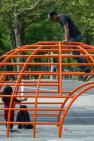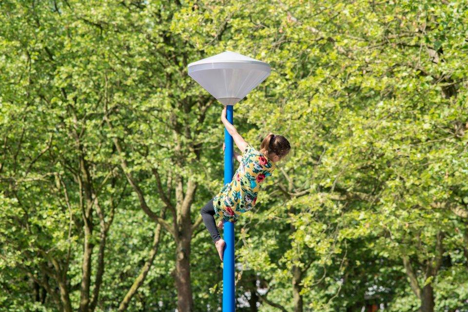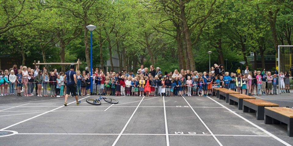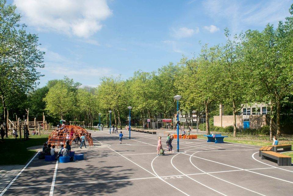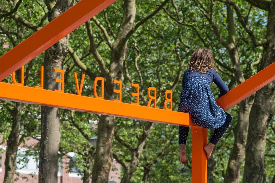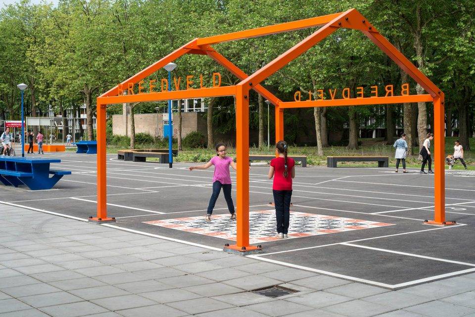 Het Breed 是阿姆斯特丹北部一個基于理論住宅定義的現(xiàn)代主義社區(qū),由 Frans Van Gool 在 1963 設(shè)計。這是一個88米×17米長的公共廣場,橫跨社區(qū)中央聚集的所有道路,設(shè)計師在這里創(chuàng)造了一個新的鄰里中心。瀝青廣場的型態(tài)基于原始的鄰里網(wǎng)格,設(shè)計師用白色的標(biāo)記線在空間內(nèi)將這些網(wǎng)格變成了可視化的真是存在。在這些格點上被放置了不同的游樂設(shè)施,這些設(shè)施的型態(tài)設(shè)計靈感都來自于阿姆斯特丹的現(xiàn)代主義游樂場,Aldo van Eyck。
