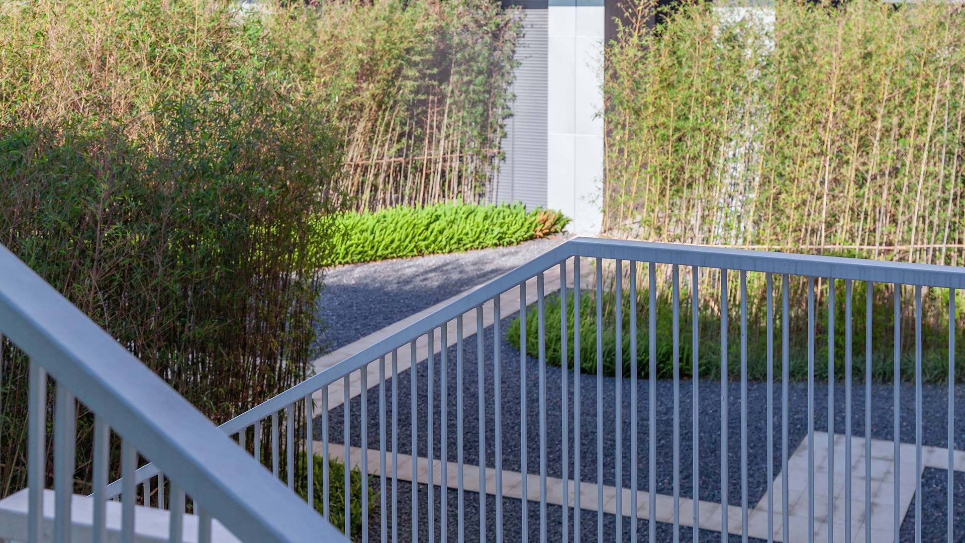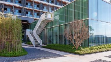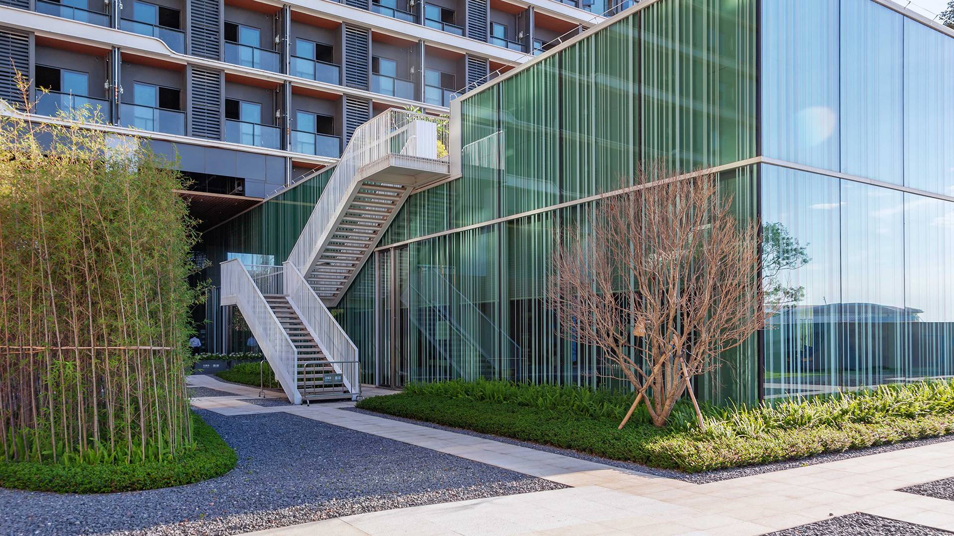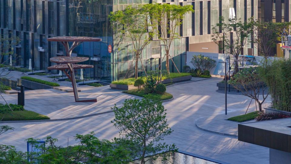 竹因園而茂,園因竹而勝;竹因景而活,園因竹而顯。綠竹成蔭的小徑,使游人在“動觀”中感受到深邃、優(yōu)美的意境。拔地而起的竹子呼應室外樓梯及建筑玻璃墻豎向內飾創(chuàng)造的線性空間,象征著深圳大都市向上的力量,打造有韻律的空間感受。場地上,設計利用竹子的不同形態(tài)來分隔區(qū)域,形成半遮半陽、虛實分隔的空間,使建筑與景觀相互交融。