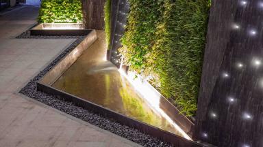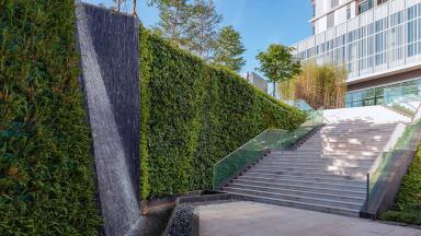 折疊線條圍合的光影下釋放駐留旅人步伐的磁力。休息區(qū)采用下沉式設計,植物墻設計將綠意定格,以鋼板為幕的瀑布潺潺淌過,猶如自然環(huán)境的一面鏡子,呈現(xiàn)出豐富生態(tài)景觀。一番曲徑通幽后拾階而上,在這里,時光也悠悠然慢了下來。