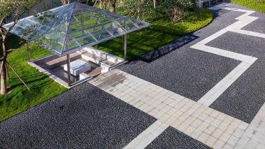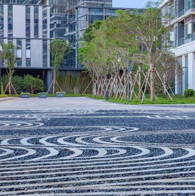 以砂石代替湖海,以石塊代替山巒。流暢的波紋猶如緩緩溪流,干凈明快的灰白色,呈現(xiàn)出其中所濃縮的浩瀚景象及禪意,給人們帶來一種寧靜、深遠的感觸,創(chuàng)造靜謐舒適的休憩空間。