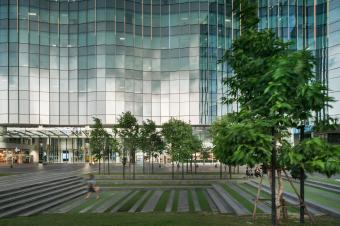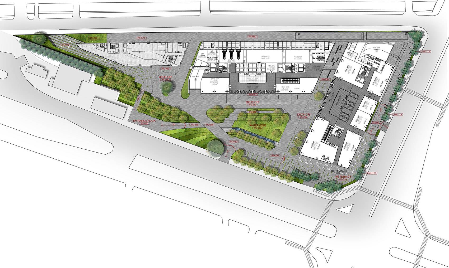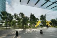 FYI景觀設(shè)計(jì)不僅僅是建筑師的成果,也是眾多顧問團(tuán)隊(duì)共同努力的成果,他們的投入、要求和限制共同完成了景觀的最終設(shè)計(jì)。下沉Water Hole可以作為緊急蓄水池,斜坡草坪阻擋了街道視野并增加了建筑對(duì)綠色環(huán)境的可見度,這實(shí)際上是由于隱藏地下室停車場(chǎng)通風(fēng)口和一系列解決土層深度不足措施所導(dǎo)致的景觀特征。整個(gè)景觀中的人行道和穿過車道的人行橫道,它們的形狀是由企業(yè)形象和Mr. & Mrs. Sparks雕塑位置共同決定的。