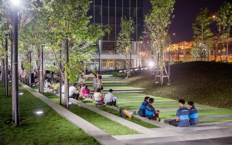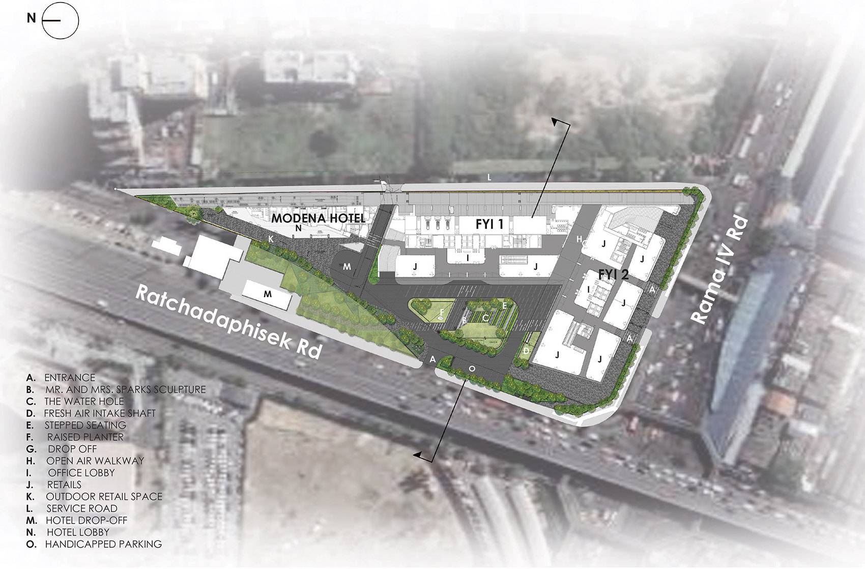 FYI中心,意為“For Your Inspiration(為了你的靈感)”,是Klongtoey的綜合開發(fā)項(xiàng)目。項(xiàng)目位于CBD外并評(píng)級(jí)為B+,它以一站式、24-7全天候共享設(shè)施和靈活的實(shí)用性吸引著中小企業(yè)和創(chuàng)業(yè)者。公共開放空間是規(guī)定的一部分,業(yè)主希望這個(gè)空間能夠在耐用性、風(fēng)格、多用途、低維護(hù)和創(chuàng)收方面經(jīng)得起時(shí)間考驗(yàn)。設(shè)計(jì)中同樣重要一點(diǎn)是整個(gè)項(xiàng)目團(tuán)隊(duì)共同努力,采用了簡(jiǎn)單、實(shí)用且富有創(chuàng)意的景觀解決方案。