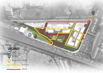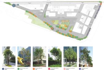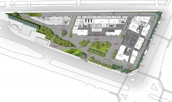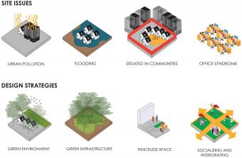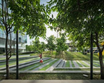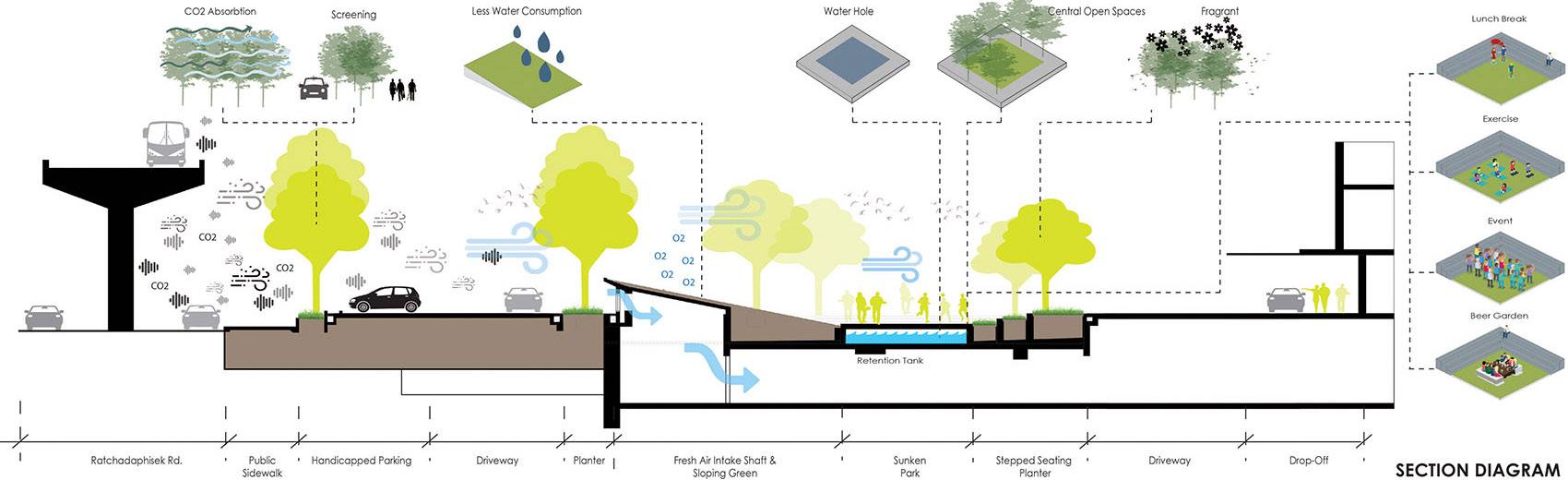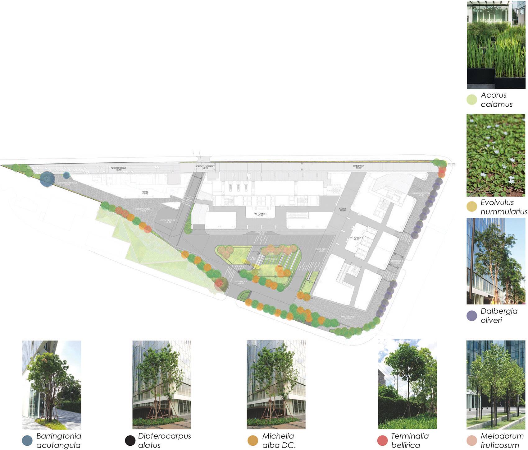 場(chǎng)地是一個(gè)位于Klongtoey東北角三角形8-rai地塊,項(xiàng)目需要建在沿地塊東側(cè)和南側(cè)的現(xiàn)有結(jié)構(gòu)上,因此三棟建筑不可避免的需要面對(duì)西曬和Ratchadaphisek公路上立交橋的影響。南面是Rama IV公路,公路對(duì)面是Klongtoey市場(chǎng)。街道擁擠、空氣質(zhì)量差、噪聲污染嚴(yán)重,但白天夜間的街頭小販、摩托車出租車站使街道充滿活力。景觀設(shè)計(jì)解決方法很簡(jiǎn)單,栽種植物用于減少污染(見種植設(shè)計(jì)部分),用簡(jiǎn)單的可滲透性邊界圍住周邊的城市活動(dòng)。