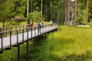 公園中樹木與光線相互交織,形成了一層由歷史森林街區(qū)、公園窗戶和長長的草地組成的滲透膜。光于影的相互作用引導(dǎo)游客更加深入地探索公園,而長走廊和波光粼粼的水面則成為了令人眼前一亮的景點(diǎn)。茂密的森林與一系列簡單清晰的空間景觀交織在一起,將光、空氣和空間引入森林,而不損害森林原有的神秘的光環(huán)。