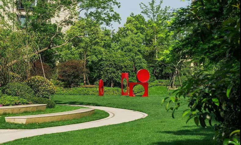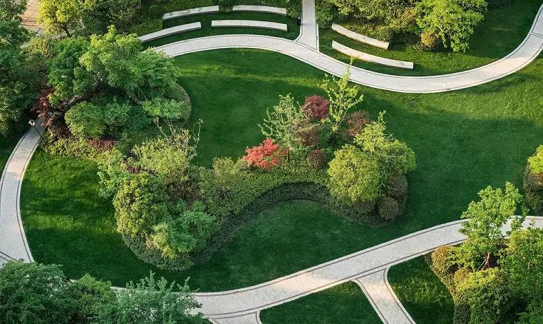 而在大空間內(nèi),為了打破草坪的單調(diào)性,設(shè)計師在其間配置有形態(tài)各異的特色雕塑,并選擇性的以植被結(jié)合,賦予雕塑自然的屬性,讓行者忍不住駐足,為這一場精妙的結(jié)合喝彩。