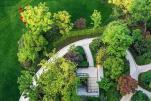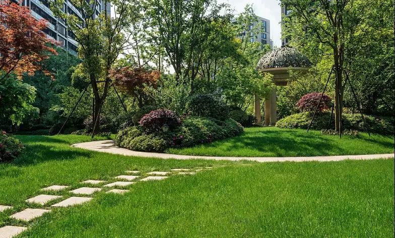 嵌入草坪的錯落汀步給予了行者親近自然的機(jī)會,在茂密的植物叢中簡約的法式景亭若隱若現(xiàn),緩步行至景亭空間,感受著喬木枝條的虬勁和綠葉的舒展,心情變得平靜流長,連時間似乎也慢了下來。