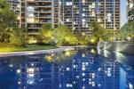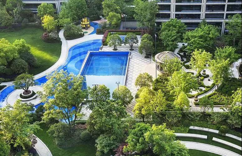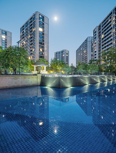 園區(qū)內(nèi)的泳池隨著地塊的高低起伏被抬高,深淺泳池被植物巧妙的隔開?;⌒嗡{(lán)色鋪裝侵染在淺層的水面下柔化了方形泳池帶來的僵硬感,并與泳池邊際無縫連接,將停落在泳池上的視野延展開來。