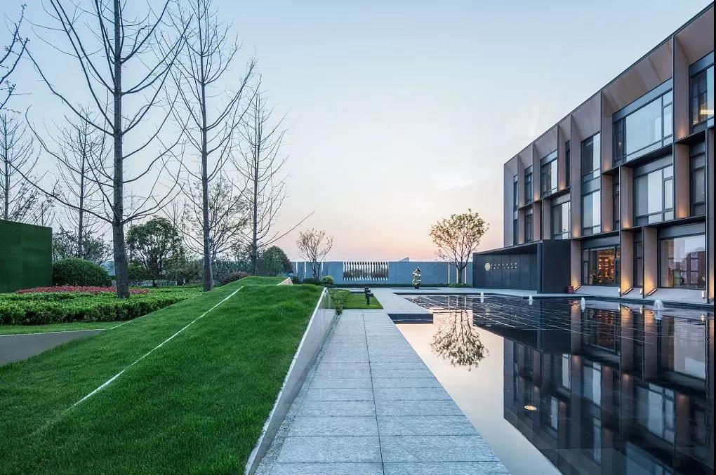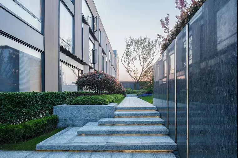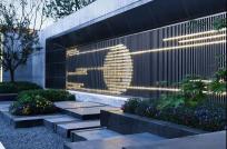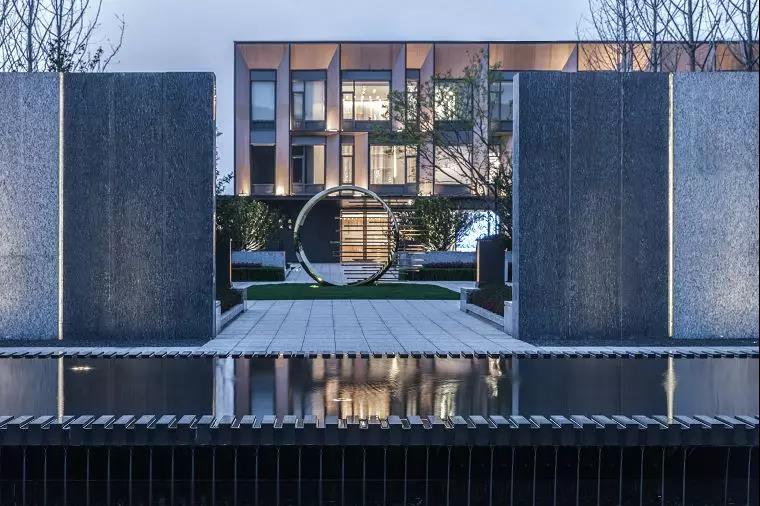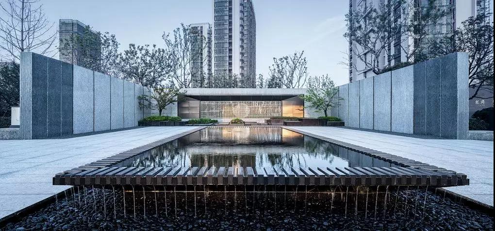 進(jìn)入示范區(qū)空間,眼之所及是鏡面水景與跌水的完美融合,靈巧的細(xì)流跌水隨著水景臺的造型凹槽緩緩跌入黑色的鵝卵石間,碰撞出清脆的流水聲,將整個空間都變得活躍起來,但靜謐的鏡面水景并未受過多的影響,依然平緩的映襯著燈光、建筑,在動與靜之間,入口空間隨著倒影變得寬闊起來,一切都是剛剛好的樣子。