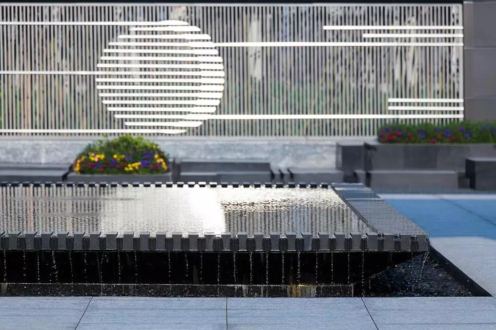 “靈巧的細(xì)流跌水隨著水景臺的造型凹槽緩緩跌入黑色的鵝卵石間,碰撞出清脆的流水聲,將整個空間都變得活躍起來”