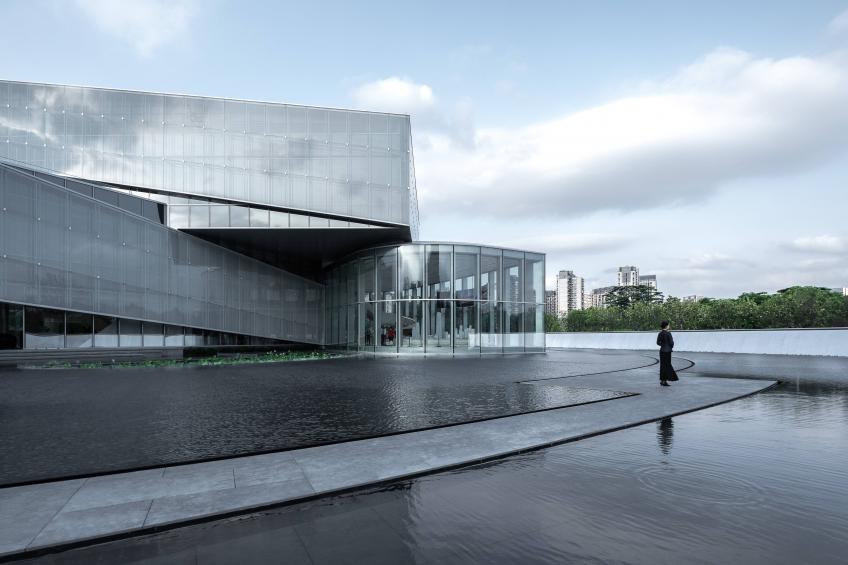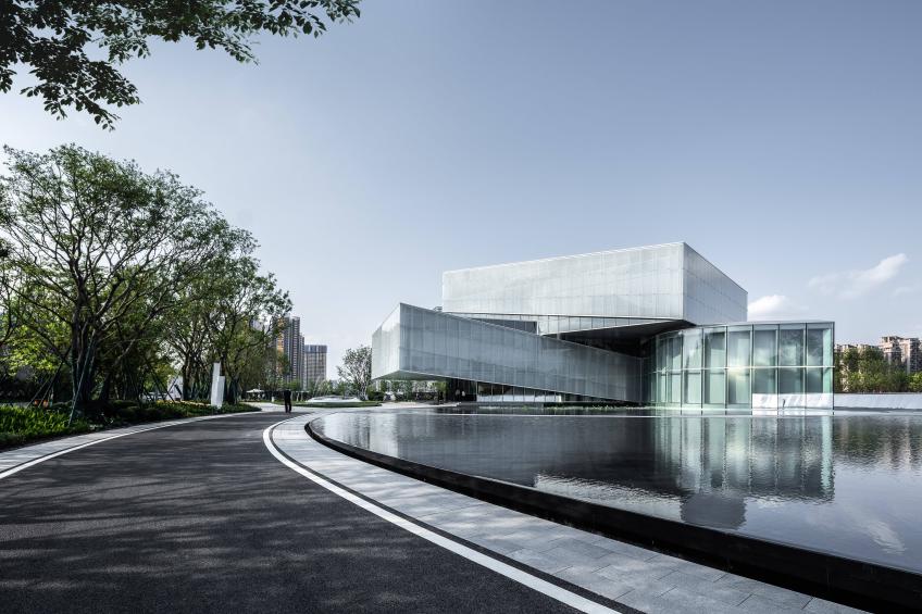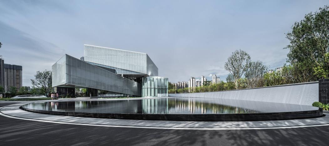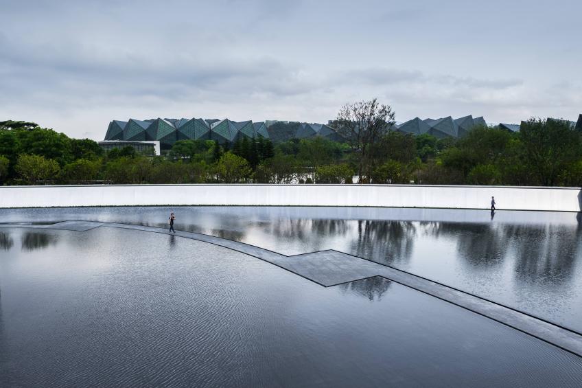 設計師采用了大水面的打造手法,延展景觀空間,水面間有綠植作點綴,打破水面單調(diào)性的同時呼應水面外的景觀世界。人行道與車型道圍繞水景輪廓打造,使開車前往展示區(qū)的游覽者可以從水景中舒緩一番開車帶來的疲勞思緒,而步行進入展示區(qū)的游覽者則能漫步于水景間,體會親水的快樂與放松。