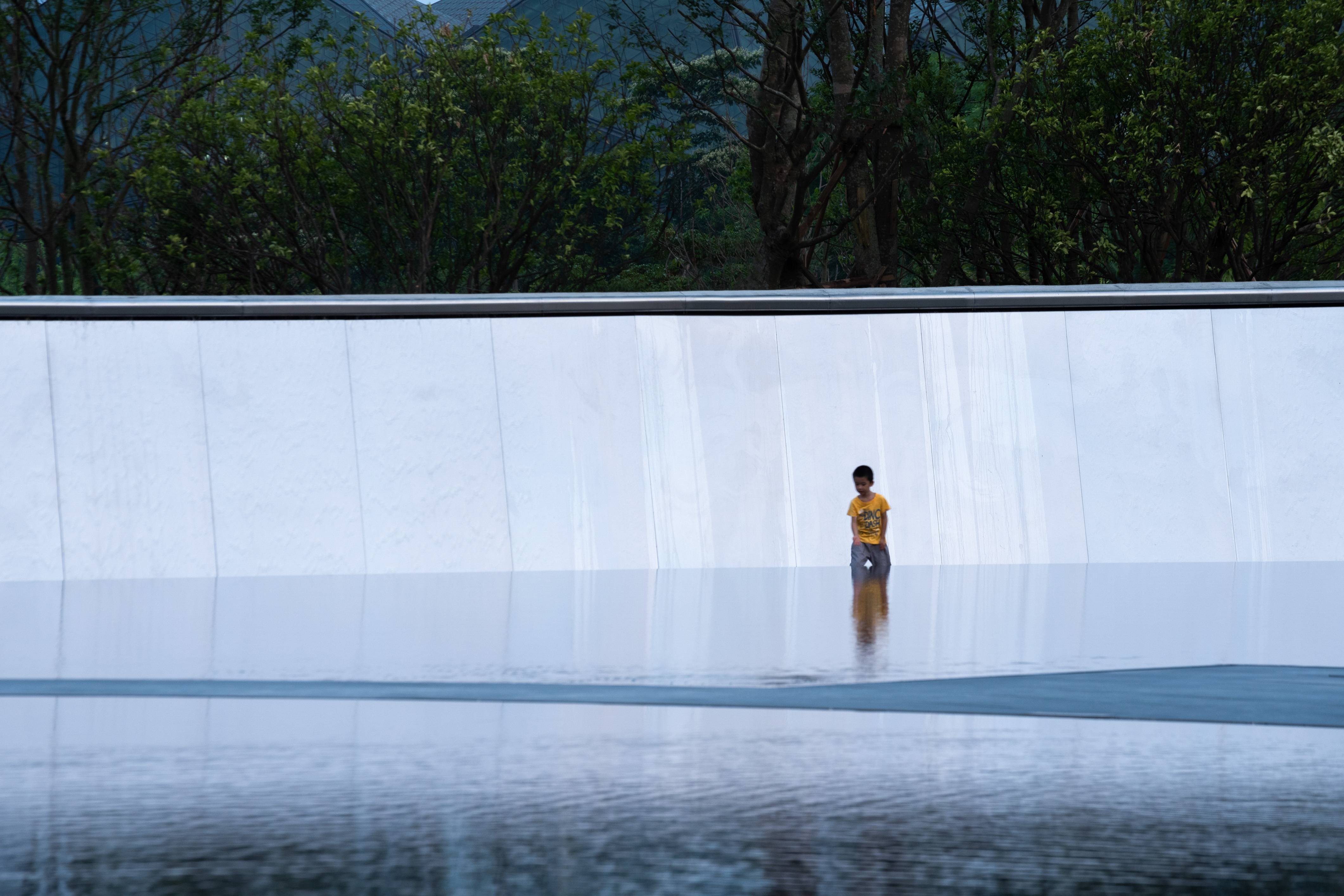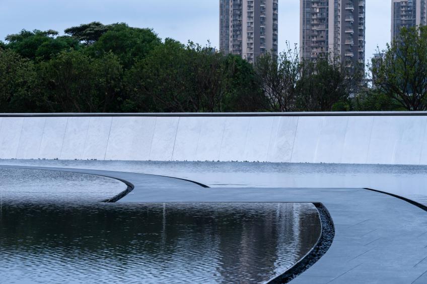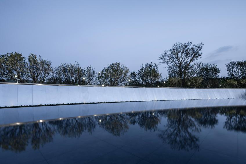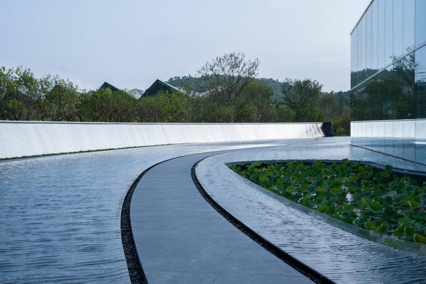 與鏡面水景相輔相依的是帶狀水景中滿池碧綠的荷葉和含苞待放的荷花,如人世間一方難尋的凈土,等待著為人間眾生帶來一場靈魂洗禮。透過建筑內(nèi)部向外投射目光,與之相遇的是無邊界水景與跌水擋墻,沉浸在這場水世界帶來的歡愉中,這一刻,所有的煩惱都被拋在腦后,只想全身心投入這處人間天堂。