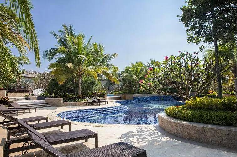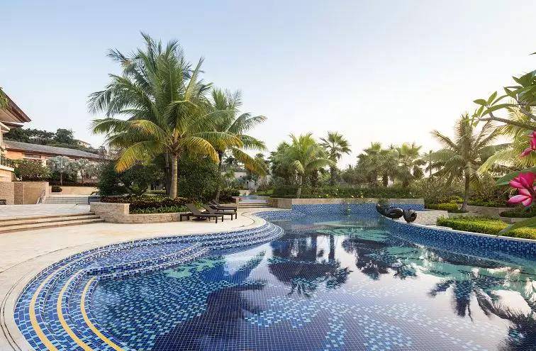 在對(duì)泳池的打造上,設(shè)計(jì)師提取海南特有的植物元素,在泳池底部鋪展出“繁花似錦”的圖案。隨著池水搖曳,池底的旖旎也不禁翩然起舞,是也,滿目風(fēng)光無限好,笑呼銀盌酌流霞。