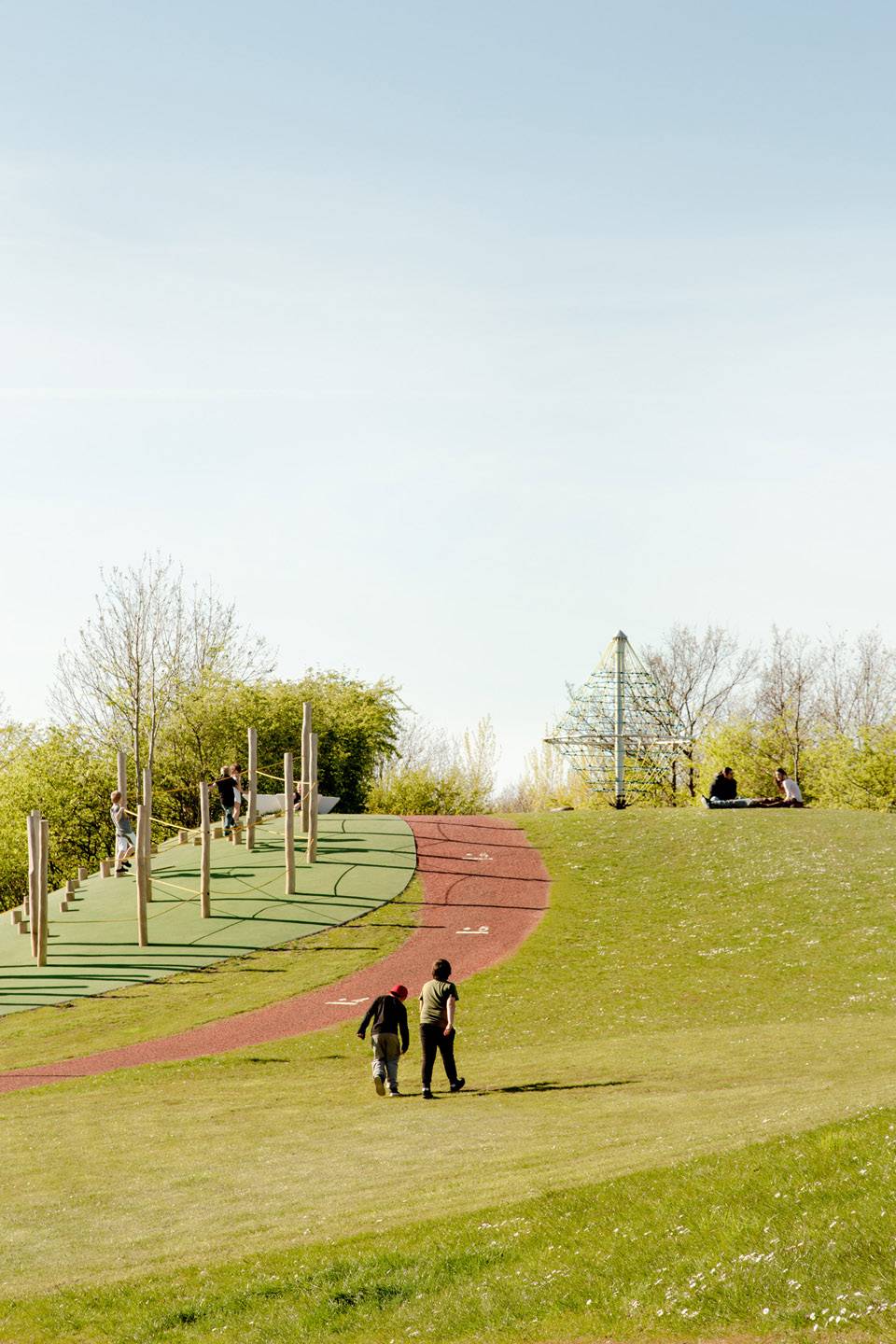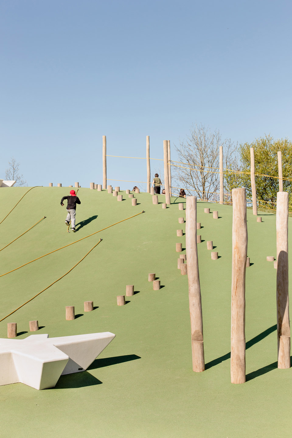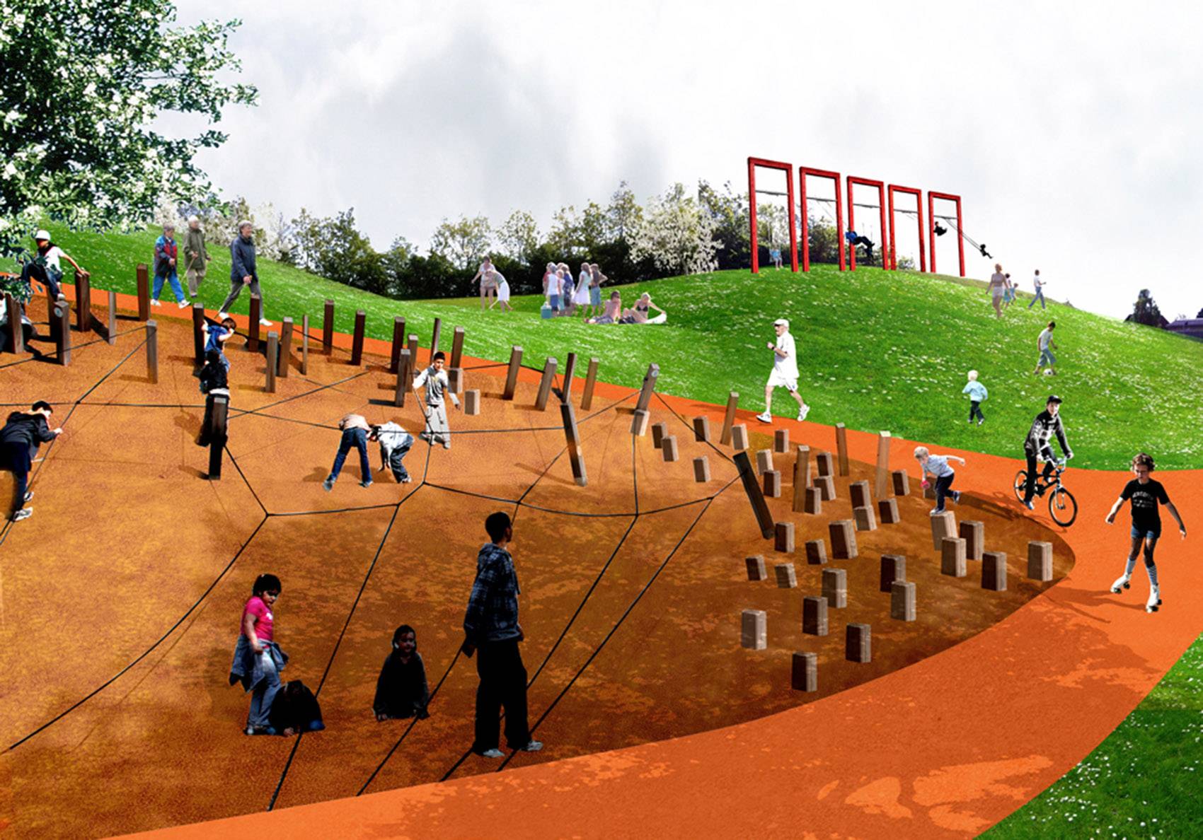 設計師希望通過本項目的設計,改變父母在游樂場上慣有的角色,其設計理念是創(chuàng)造一個可以兒童和成年人可以同時進行游戲和運動的場地。在陡峭的草坡上,大人和孩子們可以一起參與不同挑戰(zhàn)性的項目。貫穿整個場地的紅色路徑引導人們走向一條探索之旅,路徑中的樹木和灌木叢形成了的小型獨立活動場地和一些安靜的空間。