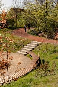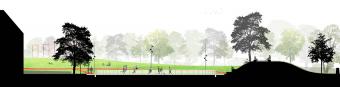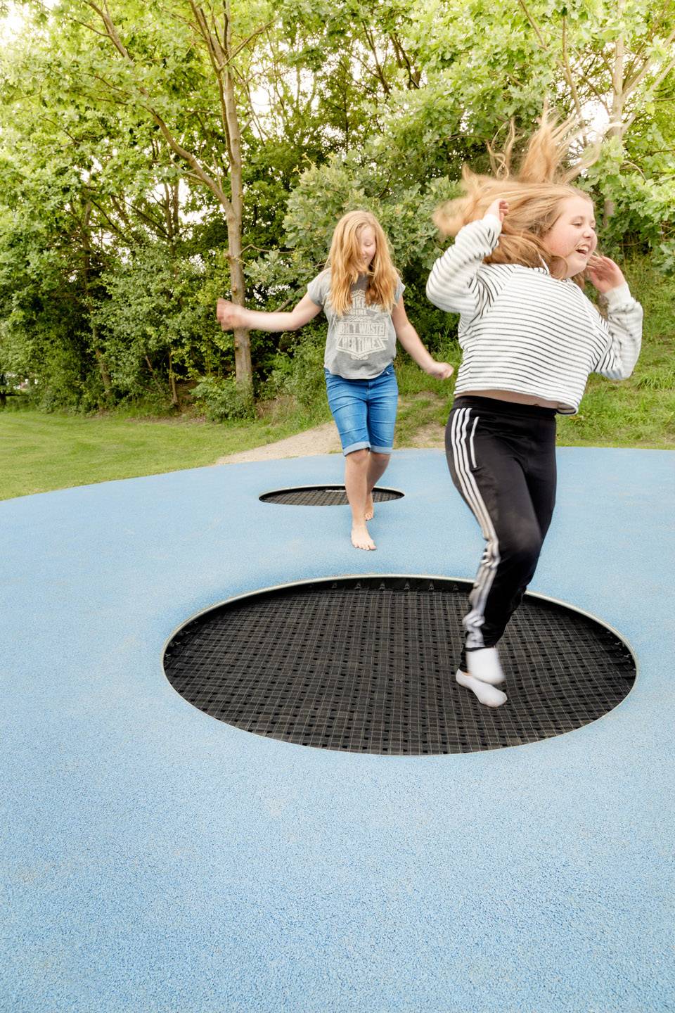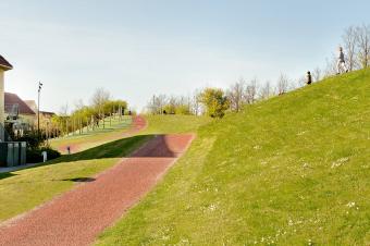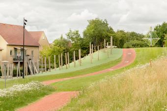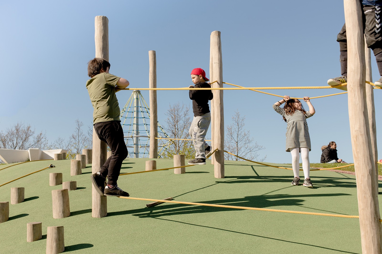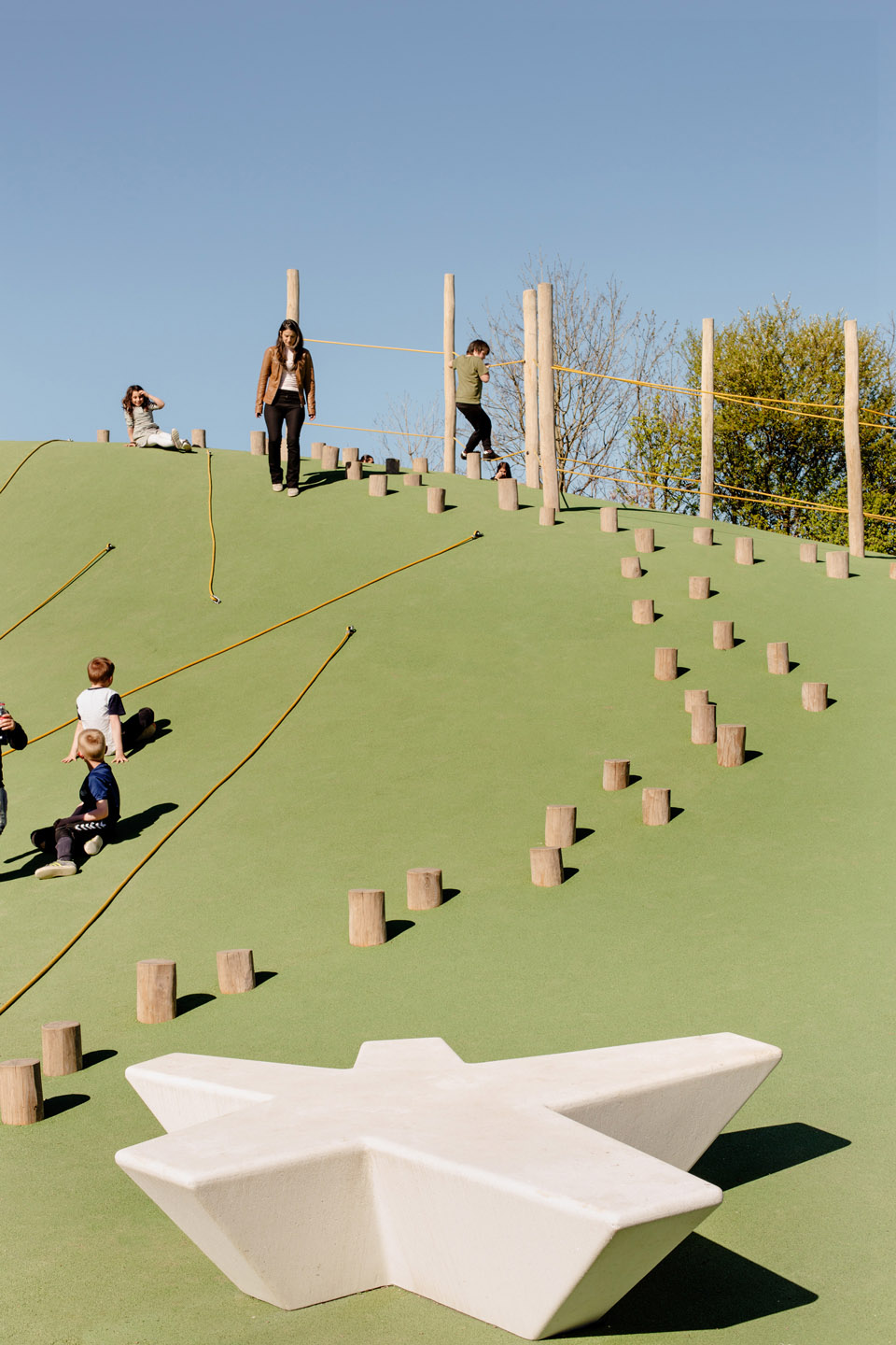 設計師希望通過本項目的設計,改變父母在游樂場上慣有的角色,其設計理念是創(chuàng)造一個可以兒童和成年人可以同時進行游戲和運動的場地。在陡峭的草坡上,大人和孩子們可以一起參與不同挑戰(zhàn)性的項目。貫穿整個場地的紅色路徑引導人們走向一條探索之旅,路徑中的樹木和灌木叢形成了的小型獨立活動場地和一些安靜的空間。