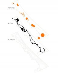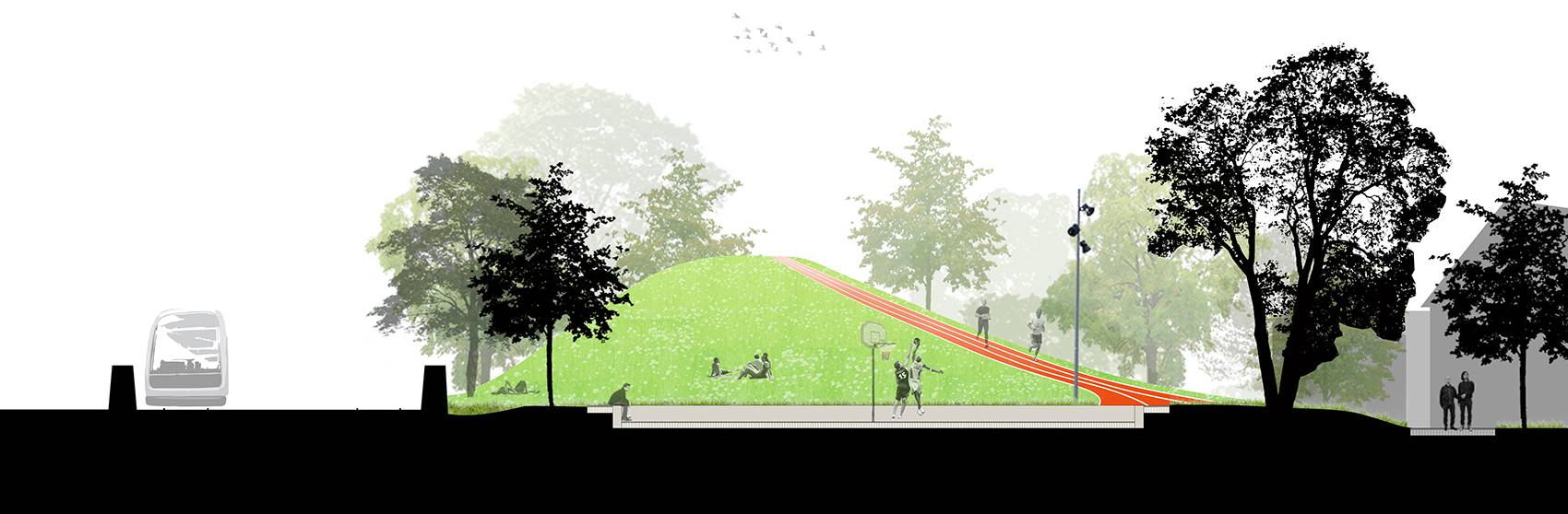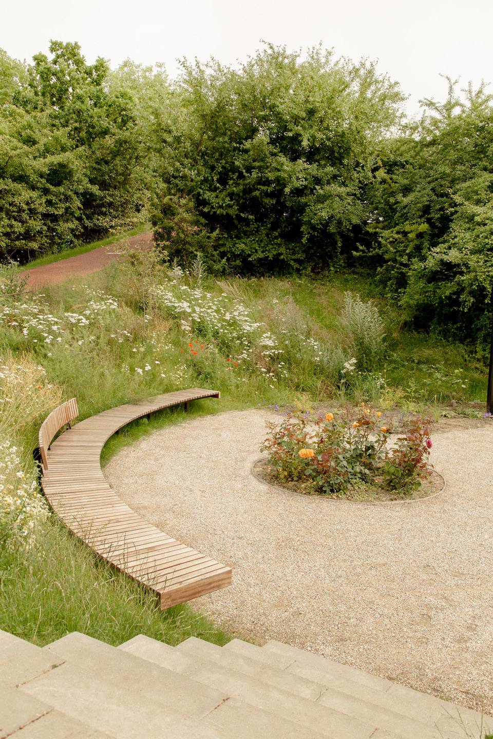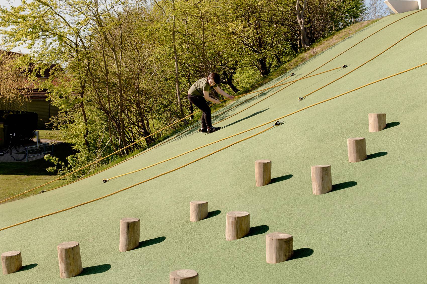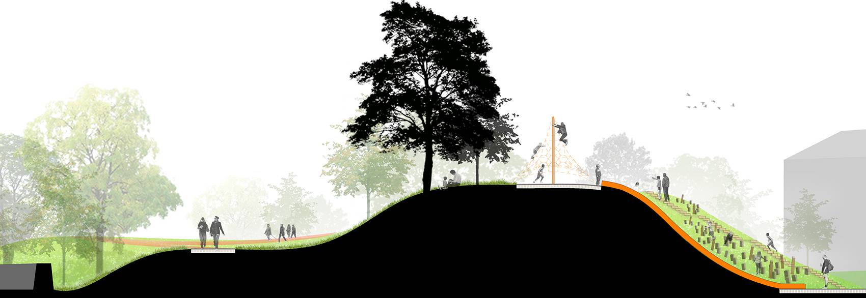 既有的場地狹窄而陡峭,且四面被建筑工地包圍,因而幾乎沒有大規(guī)模整改的余地。對此,項目團隊采用了“最小投資,最大產(chǎn)出”的設計策略。既有的場地條件為多種空間體驗提供了可能性,同時坡頂?shù)奈恢眠€能夠帶來眺望周圍區(qū)域的極佳視野。新鋪設的綠色橡膠地面便于行人攀爬而上,以獲得居高臨下的成就感。陡峭的坡地上種植了混合草種,在維持旺盛長勢的同時能夠?qū)⒕S護成本降至最低。