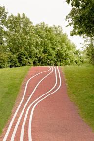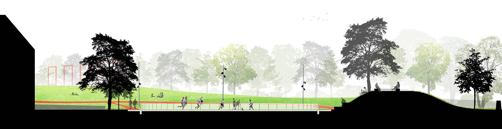 場地的靈活布局可以同時滿足人們獨自運動和集體活動的需求。公園的一部分場地被用作球場,促進人們之間的互動。沿著球場,印有距離標識的紅色路徑在球場邊緣延伸,十分適用于散步和慢跑。坡地與樹林之間形成了一個寧靜的花園,可供人們靜坐歇息,欣賞風景,聞聽花香鳥語。藍色和綠色的游戲區(qū)內(nèi)包含一系列充滿挑戰(zhàn)性的娛樂項目,吸引著不同年齡段用戶的共同參與。