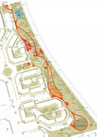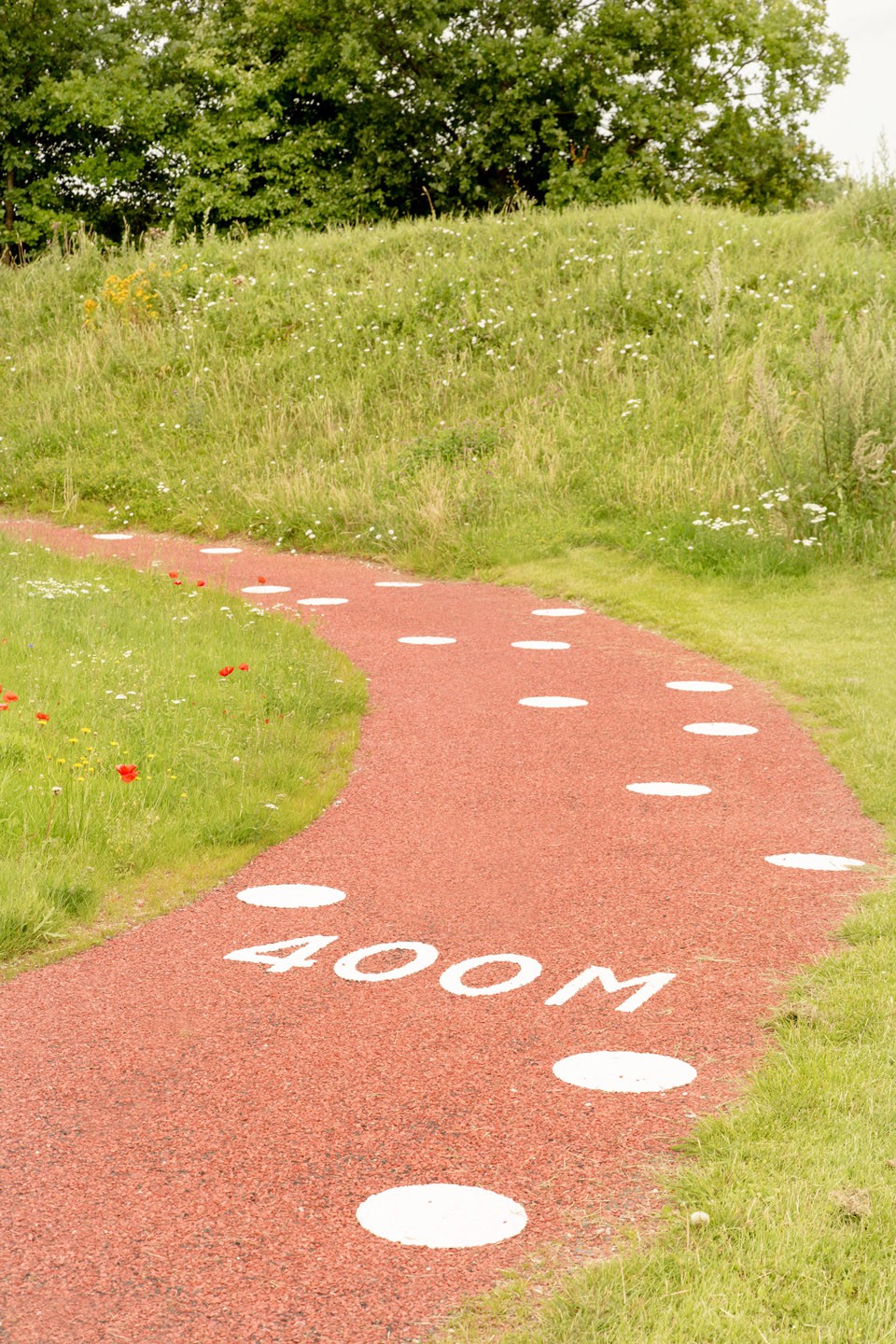 貫穿場地的紅色路徑成為連接坡地景觀和七個新主題活動場地的紐帶。新的活動場地在現(xiàn)有設施的基礎上開發(fā)出新的功能,供人們玩耍、休息、運動以及遛狗。這條蜿蜒的跑道被綠色植物環(huán)繞,隨著坡地的升降而起伏。它將景觀元素連接在一起,引導人們穿過不同主題的活動場地,讓每一個角落充滿新的體驗和驚喜。