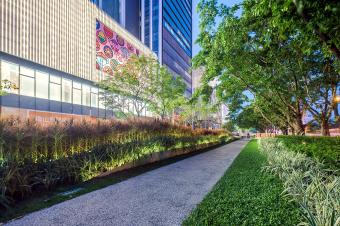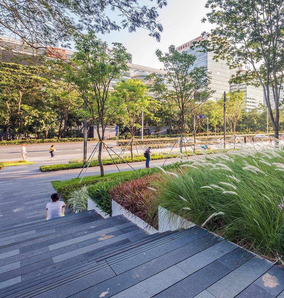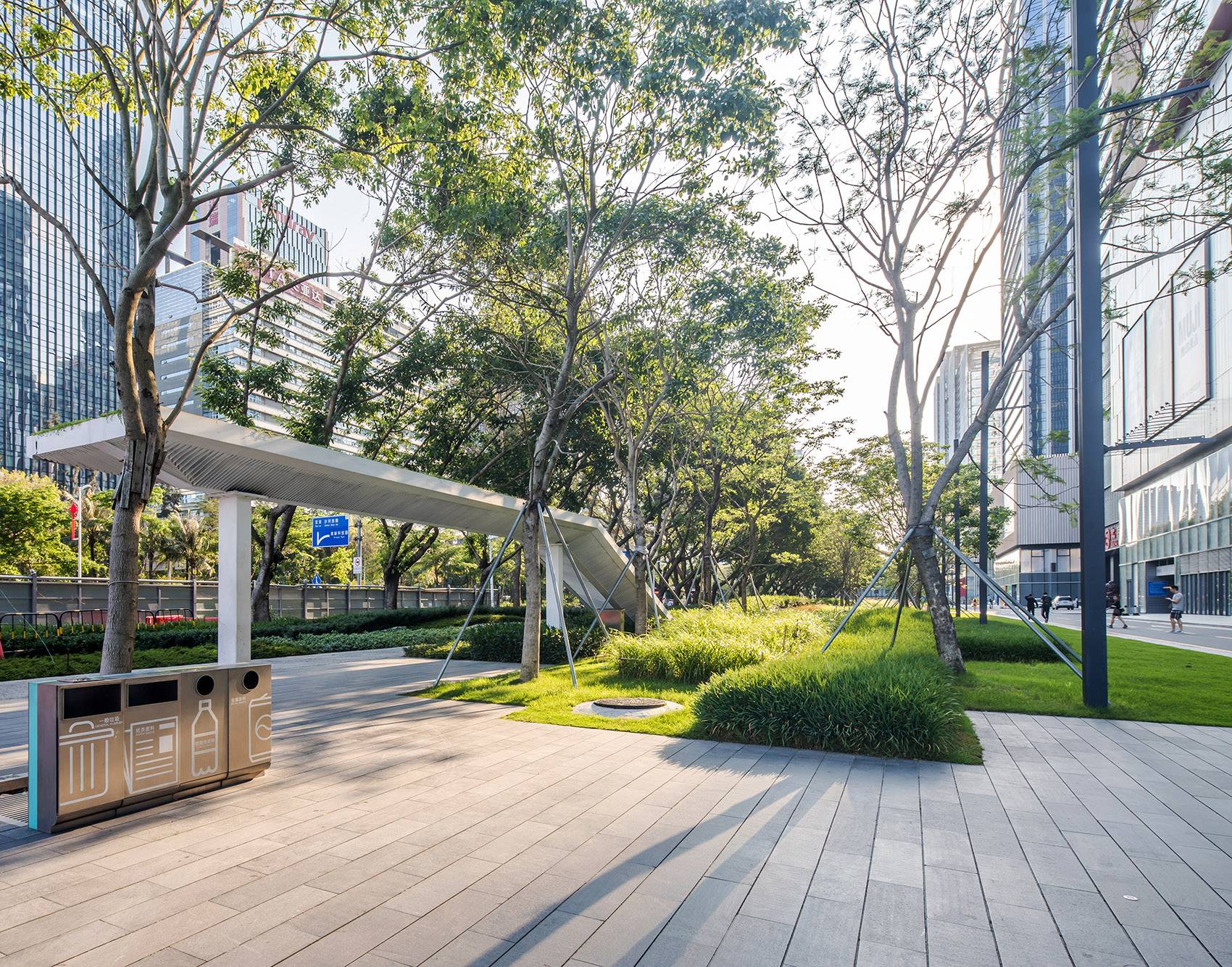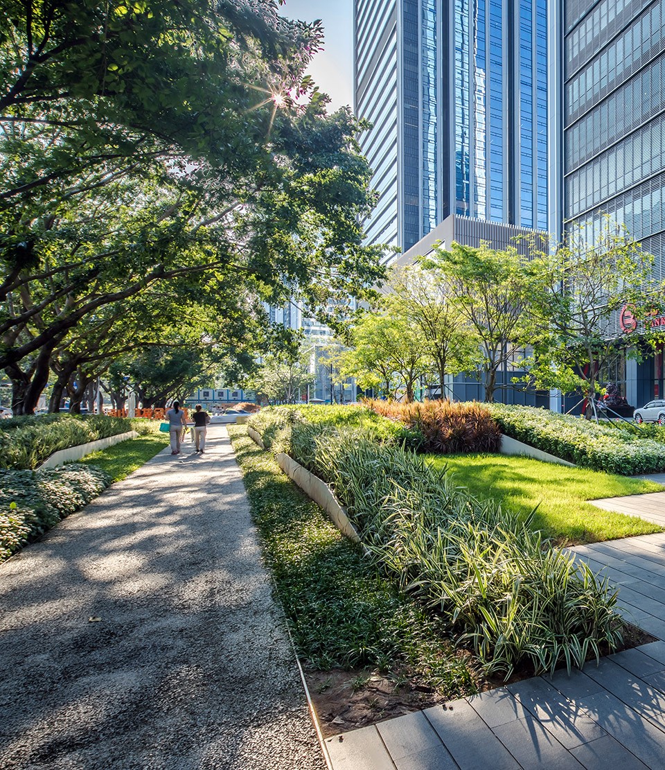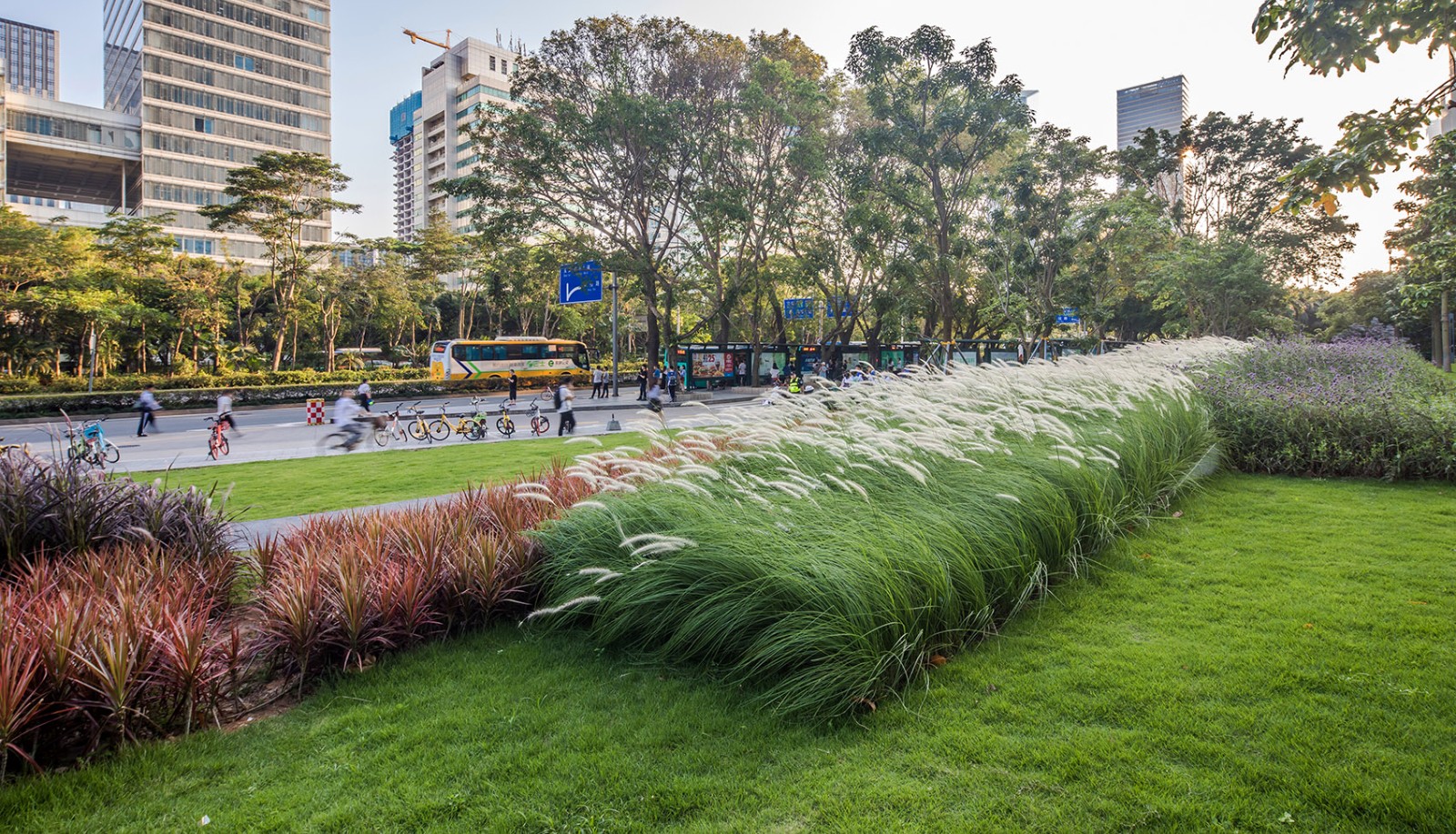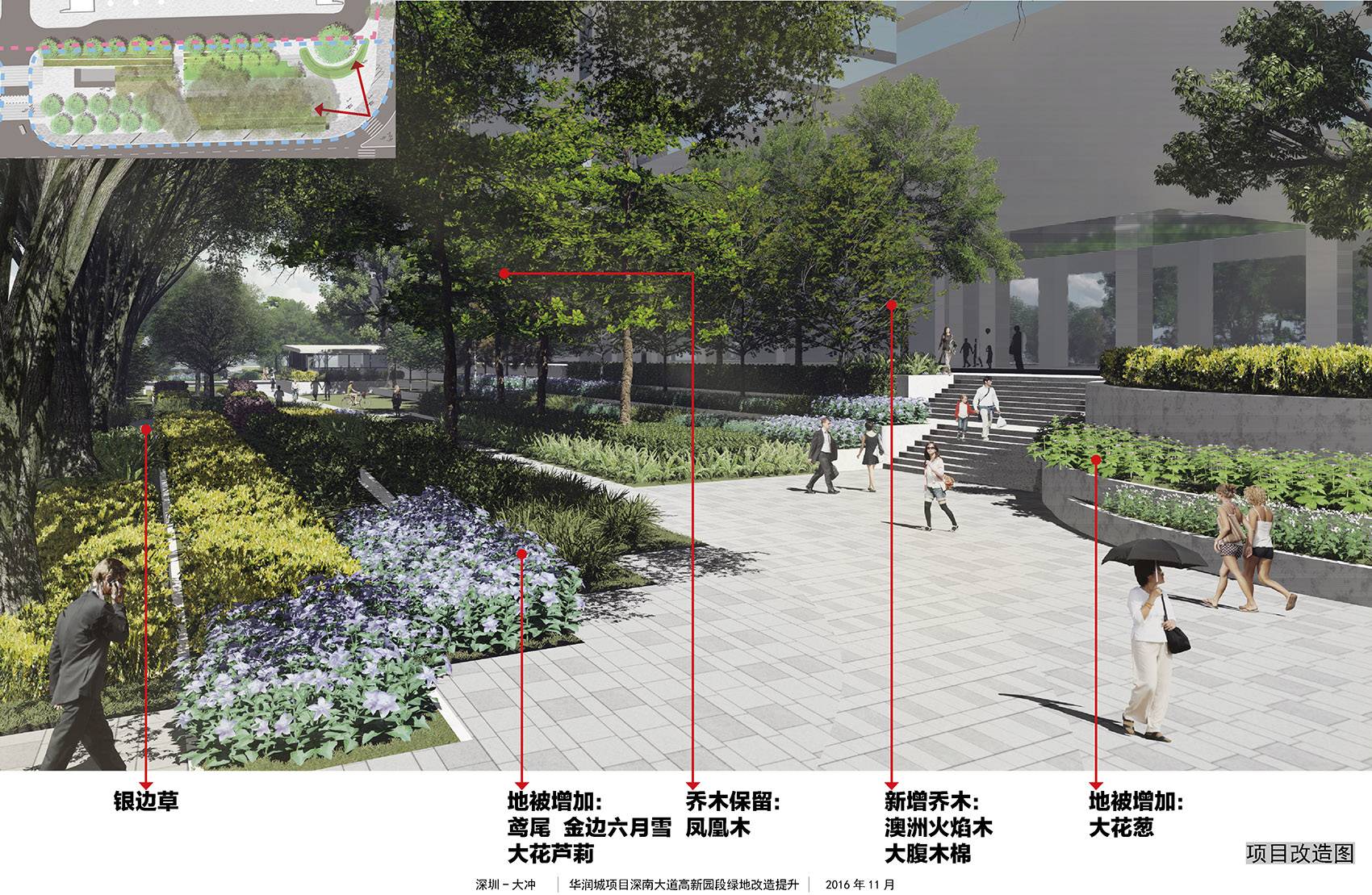 華潤(rùn)萬(wàn)象天地,由6座國(guó)際甲級(jí)寫字樓組成,以其高完整度、高空間價(jià)值、高公共辨識(shí)度,為客戶提供一種全新的辦公生活方式,是深南大道沿線具有昭示性和影響力的商務(wù)辦公力作。華潤(rùn)置地大廈由英國(guó)Foster+Partners(福斯特)建筑設(shè)計(jì)事務(wù)所擔(dān)綱整體規(guī)劃設(shè)計(jì),旨在打造成為中國(guó)具有昭示性和影響力的商務(wù)群落。倉(cāng)谷景觀參與其中華潤(rùn)城前臉-深南大道高新園段片區(qū)景觀設(shè)計(jì)。該項(xiàng)目全區(qū)整體景觀概念由大名鼎鼎的JCFO-紐約高線公園的設(shè)計(jì)公司執(zhí)筆,倉(cāng)谷景觀完成樣板段前臉的方案及落地深化部分圖紙。