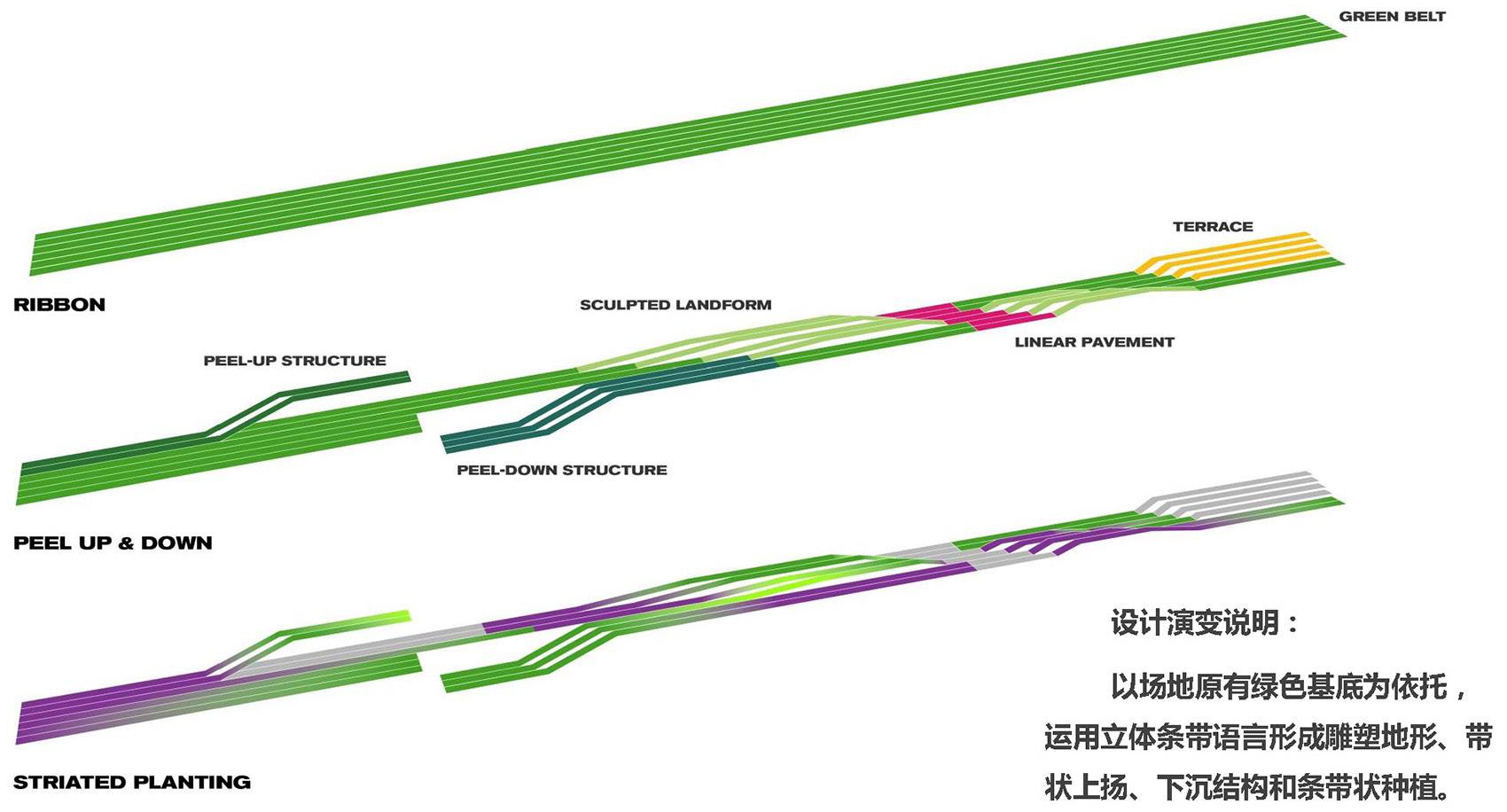 ▼設(shè)計(jì)以場(chǎng)地原有綠色基底為依托,運(yùn)用立體條帶語(yǔ)言形成雕塑地形,帶狀上揚(yáng),下沉結(jié)構(gòu)和條帶狀的種植