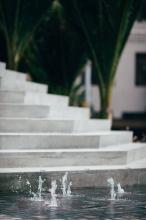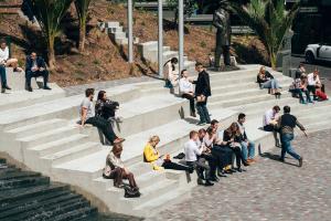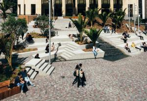 在Freyberg廣場(chǎng)中,階梯模塊的水平形式與強(qiáng)烈的垂直元素,棕櫚樹(shù)和燈桿都令人振奮,并與翻新的Ellen Melville中心的混凝土柱相連。在元素的節(jié)奏中,樓梯的景觀變得更加突出,而穿過(guò)樹(shù)林漫射的光線通過(guò)在臺(tái)階上繪制出錯(cuò)綜復(fù)雜的陰影,為這里增添了戲劇效果。