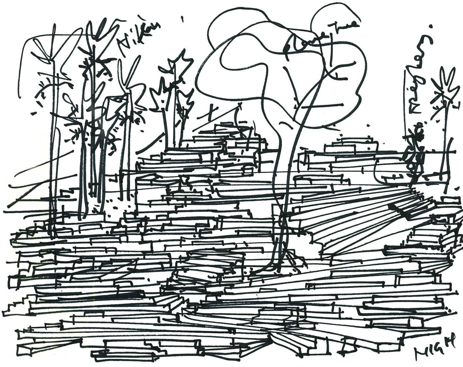 John Reynolds描述了他為期四年的嘗試,試圖開(kāi)發(fā)出適合當(dāng)?shù)厝撕陀慰偷乃囆g(shù)作品?!斑@可能是一個(gè)海市蜃樓,而不是紀(jì)念碑,”他說(shuō)?!斑@不是一個(gè)精心設(shè)計(jì)的青銅雕塑,而是一個(gè)參與性的公共裝置?!贝罅康碾A梯通過(guò)將藝術(shù)家的視野與城市設(shè)計(jì)師和景觀設(shè)計(jì)師的技術(shù)技能相結(jié)合,在城市中心創(chuàng)造出了一種公共藝術(shù)品。
