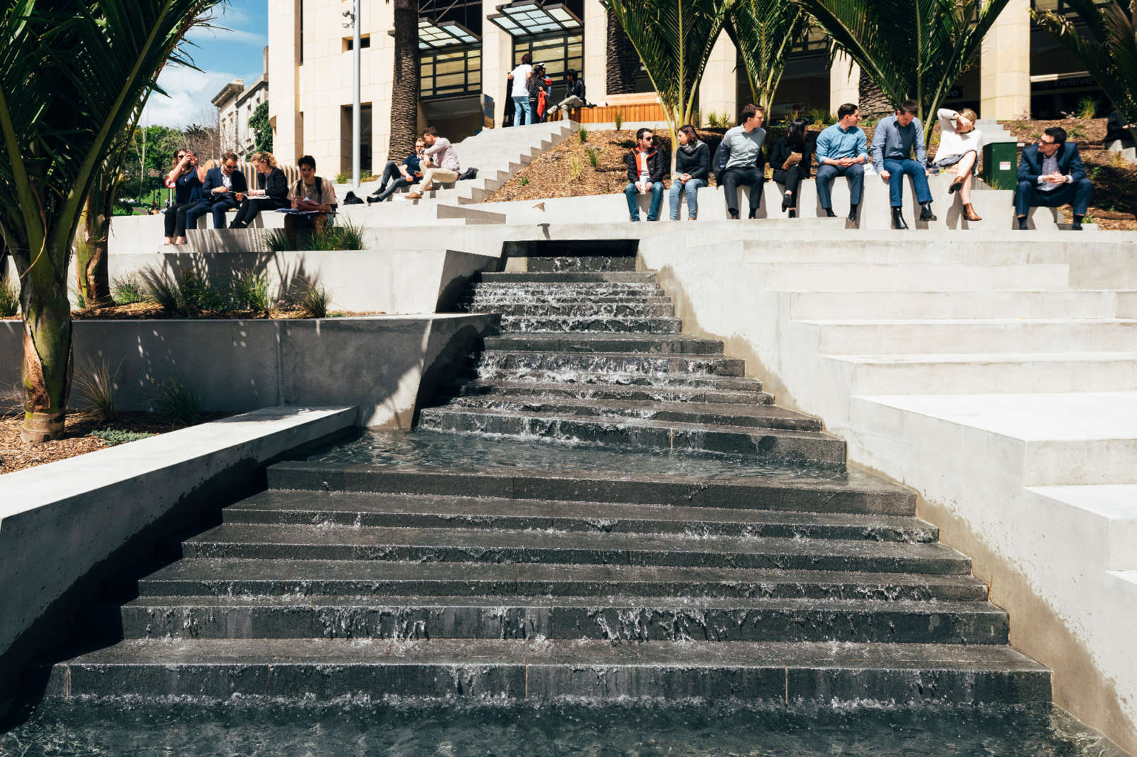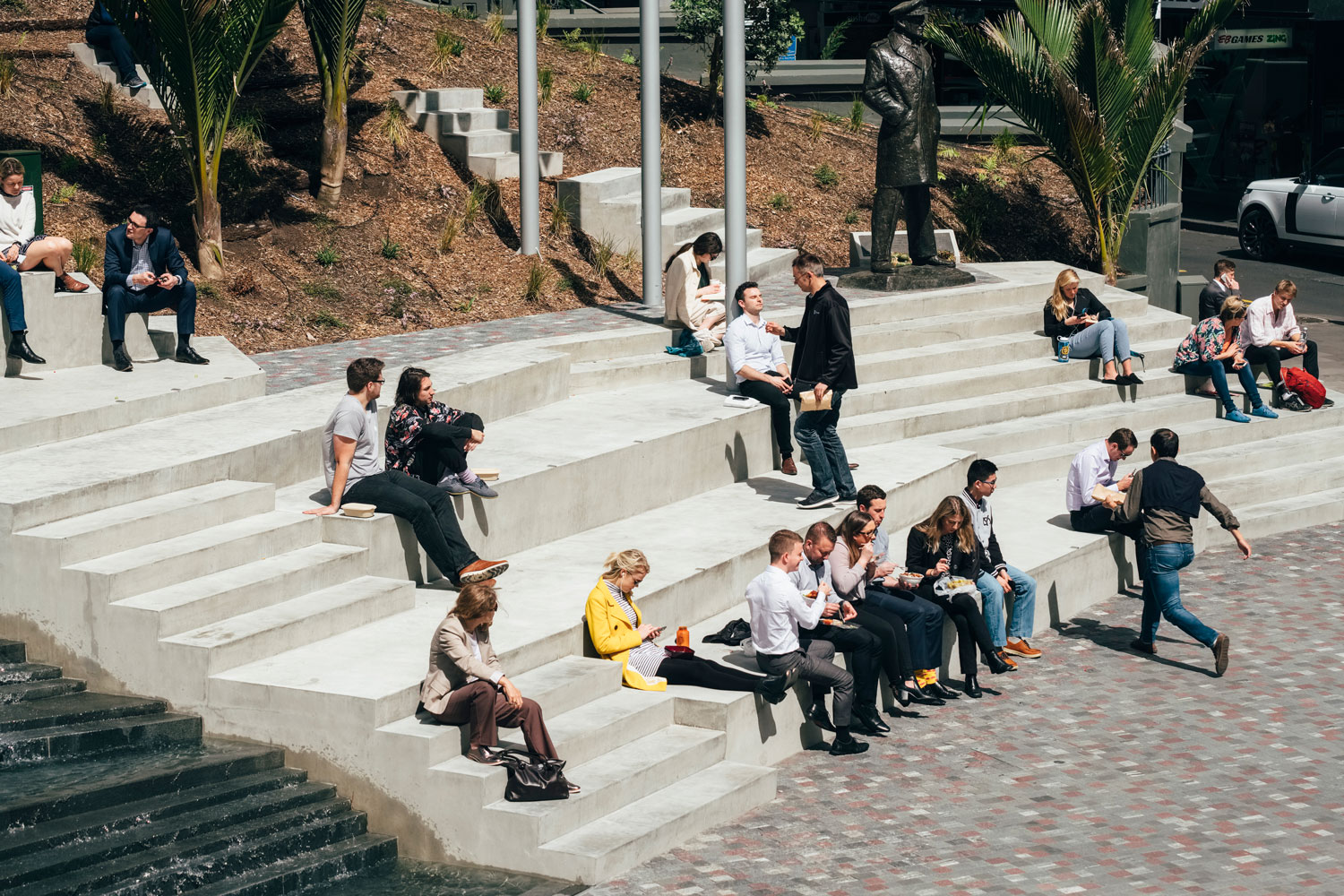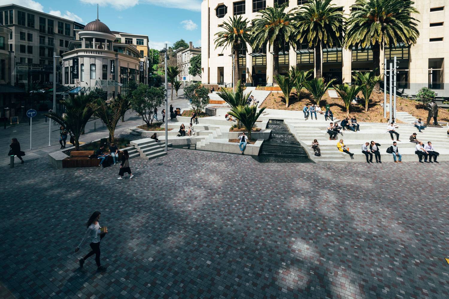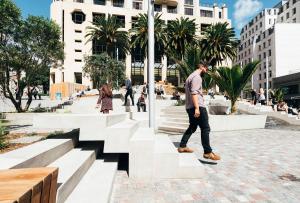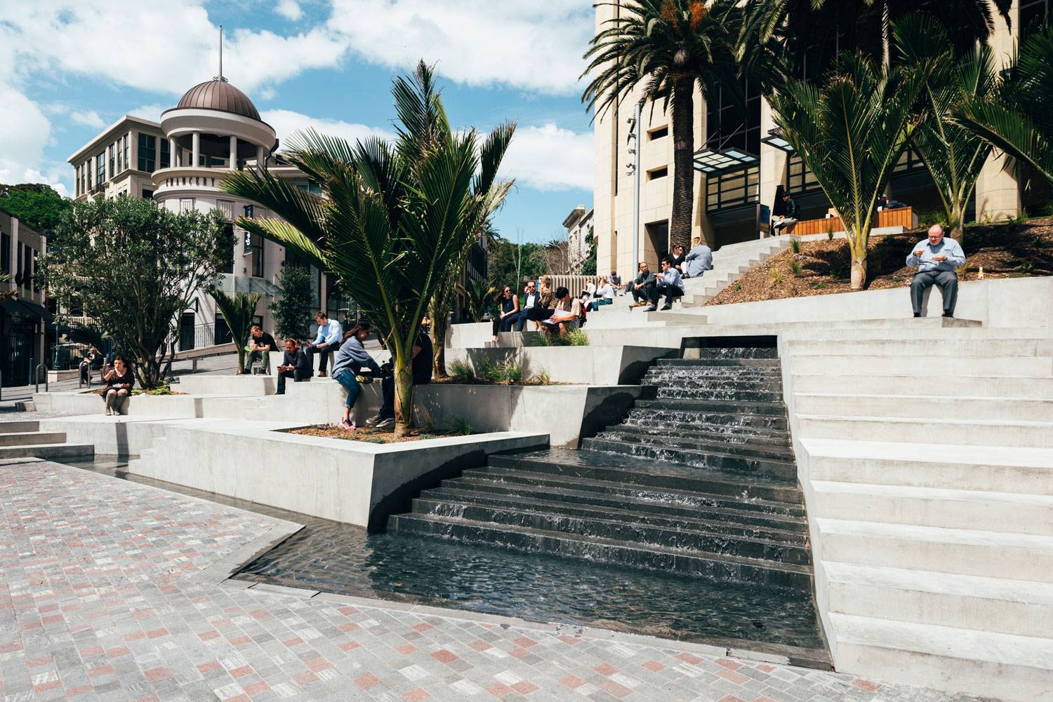 設(shè)計(jì)公司與著名的新西蘭藝術(shù)家John Reynolds 合作,引入了“一百八十九個(gè)臺(tái)階”的敘事性設(shè)計(jì)概念。在這個(gè)廣場(chǎng)上,可以看到無(wú)數(shù)相交的臺(tái)階和梯田,遍布于整個(gè)城市的階梯被放大,仿佛在城市里流動(dòng)。