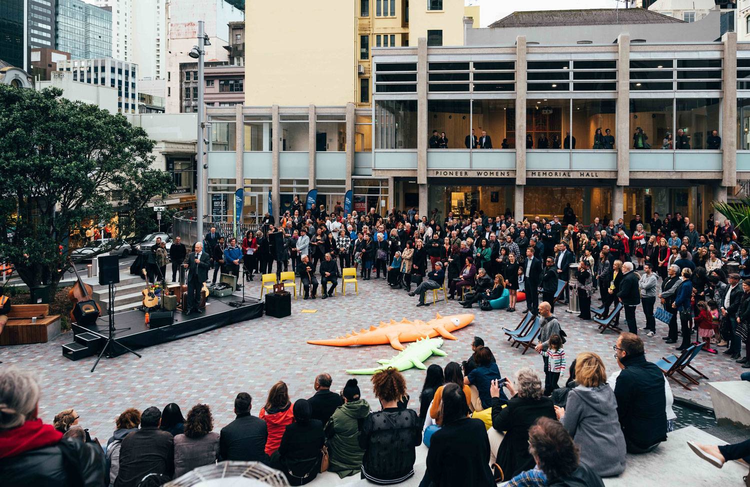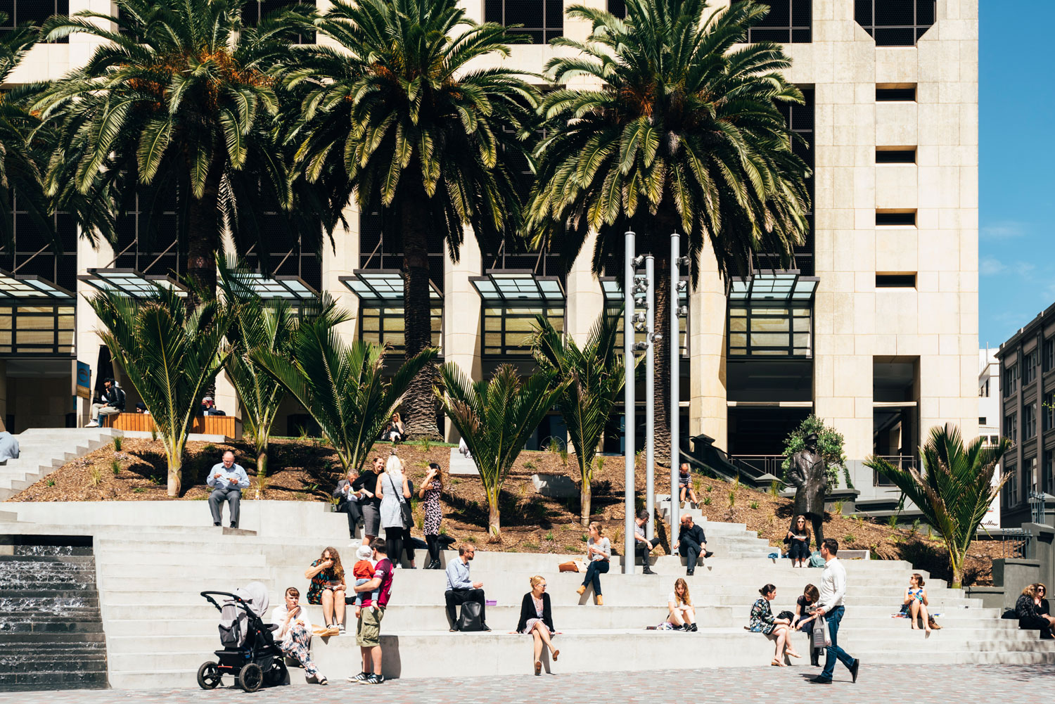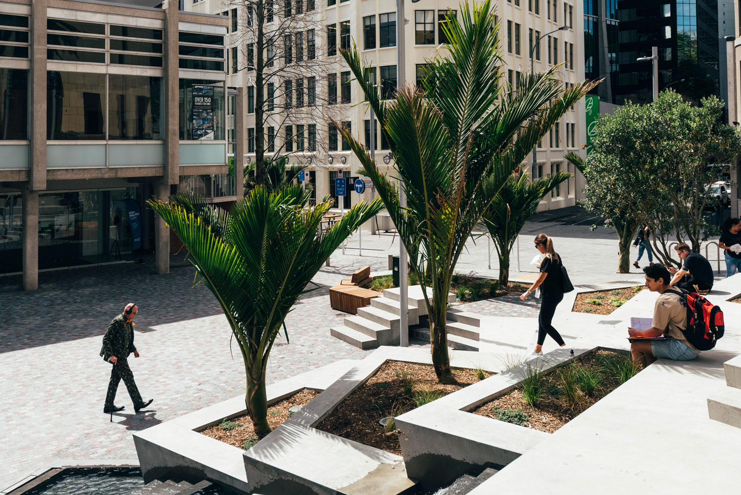 Freyberg廣場(chǎng)是一個(gè)探索公共藝術(shù)和建筑之間的關(guān)系的公共空間,它向奧克蘭人發(fā)出了邀請(qǐng),為他們提供了能夠停駐與利用的場(chǎng)所。該廣場(chǎng)位于奧克蘭市一座歷史悠久的火山腳下。憑借燦爛的陽(yáng)光,避開(kāi)盛行的西南風(fēng),它成為了當(dāng)?shù)厝撕陀慰停扇撕蛢和?,居民和工人逃離喧囂的市中心的熱門(mén)目的地。它位于城市道路網(wǎng)絡(luò)中,是一個(gè)在快節(jié)奏的周?chē)值腊鼑碌囊惶幮蓓?,也是一個(gè)適合表演,集市和其他活動(dòng)的靈活空間。