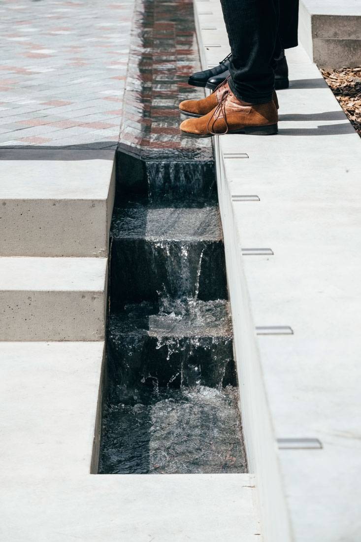 在早期設(shè)計(jì)階段向當(dāng)?shù)孛诉M(jìn)行咨詢后,設(shè)計(jì)公司制定了明確而有意義的雨水管理與材料和種植策略,來(lái)表達(dá)當(dāng)?shù)厝伺c該區(qū)域的歷史聯(lián)系?,F(xiàn)場(chǎng)混凝土露臺(tái)和臺(tái)階上點(diǎn)綴著一系列耐寒的原生樹(shù)木、灌木和地被植物,以反映200年前歐洲人來(lái)到此地之前的生態(tài)。此外,蜿蜒的水流模擬了曾經(jīng)在場(chǎng)地附近流動(dòng)的溪流,穿過(guò)階梯式梯田。