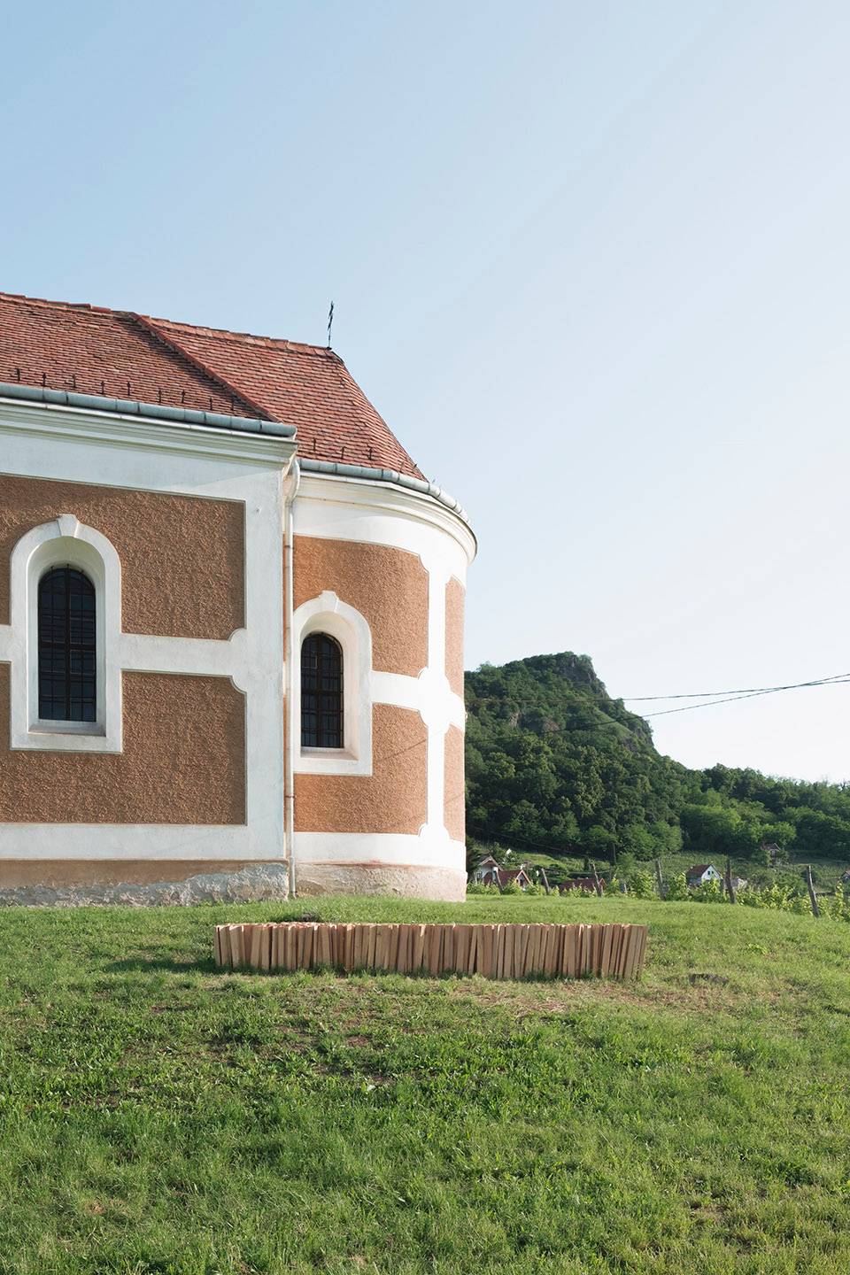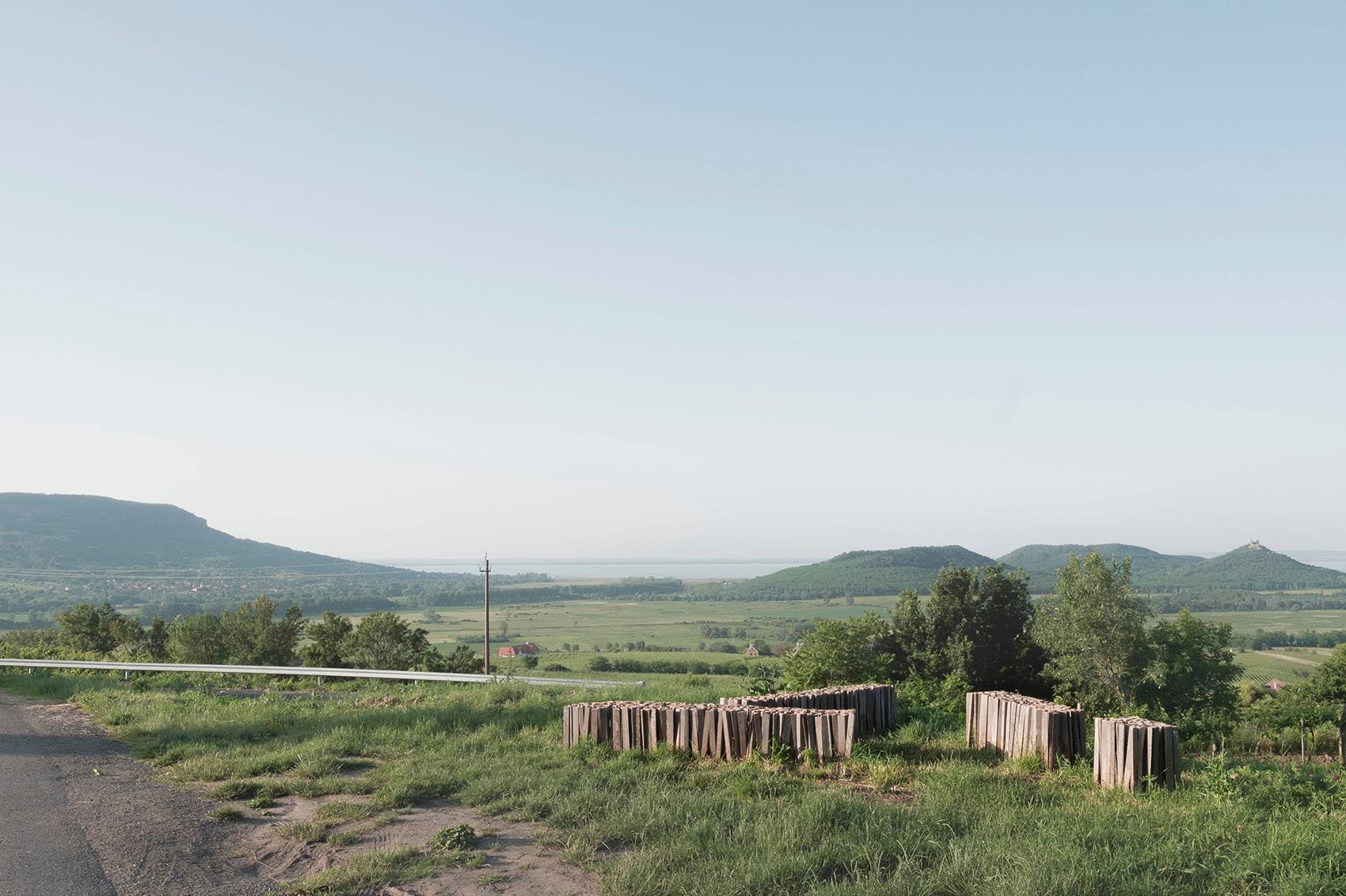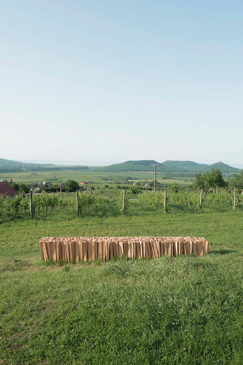 場地位于Szent Gy?rgy-hegy山,擁有可以眺望Balaton湖的絕佳風(fēng)景。設(shè)計(jì)團(tuán)隊(duì)與葡萄酒節(jié)的組織方合作,不以功能限制設(shè)計(jì),而是以為游客帶來豐富的體驗(yàn)作為目標(biāo),打造出一個(gè)可以供游客休息和欣賞風(fēng)景的場所。為了體現(xiàn)出場地的獨(dú)特性,設(shè)計(jì)團(tuán)隊(duì)以當(dāng)?shù)仄咸褕@常見的洋槐樹木樁以及山上的玄武巖構(gòu)造作為主要的材料和靈感來源,并通過簡單的方式將這些木樁緊密地排布在一起以構(gòu)成長椅。雖然每根木樁之間沒有任何連接,最終卻形成了一個(gè)極為舒適的表面。