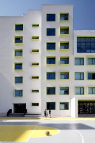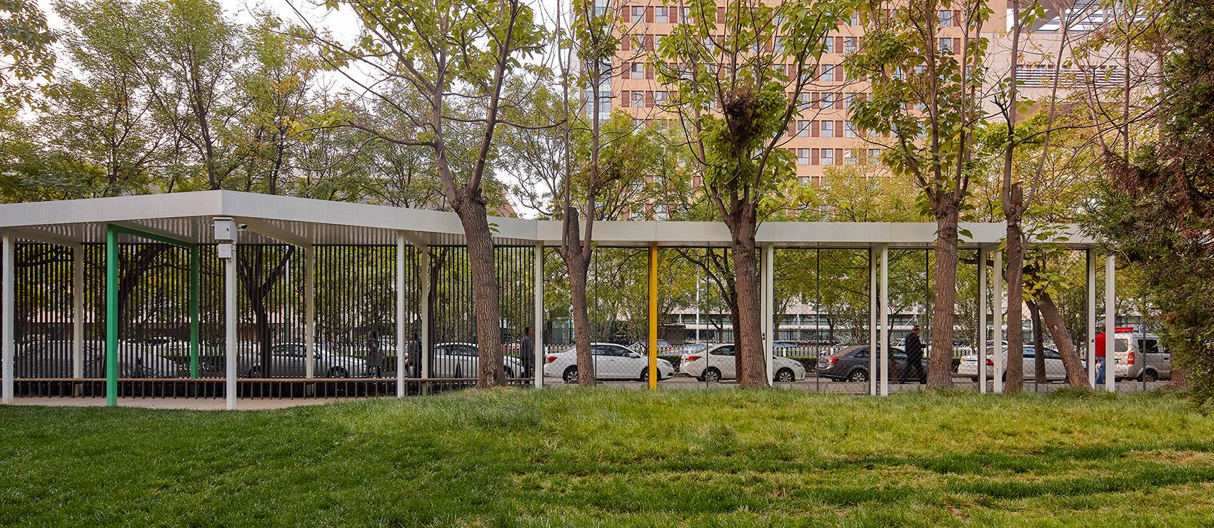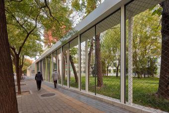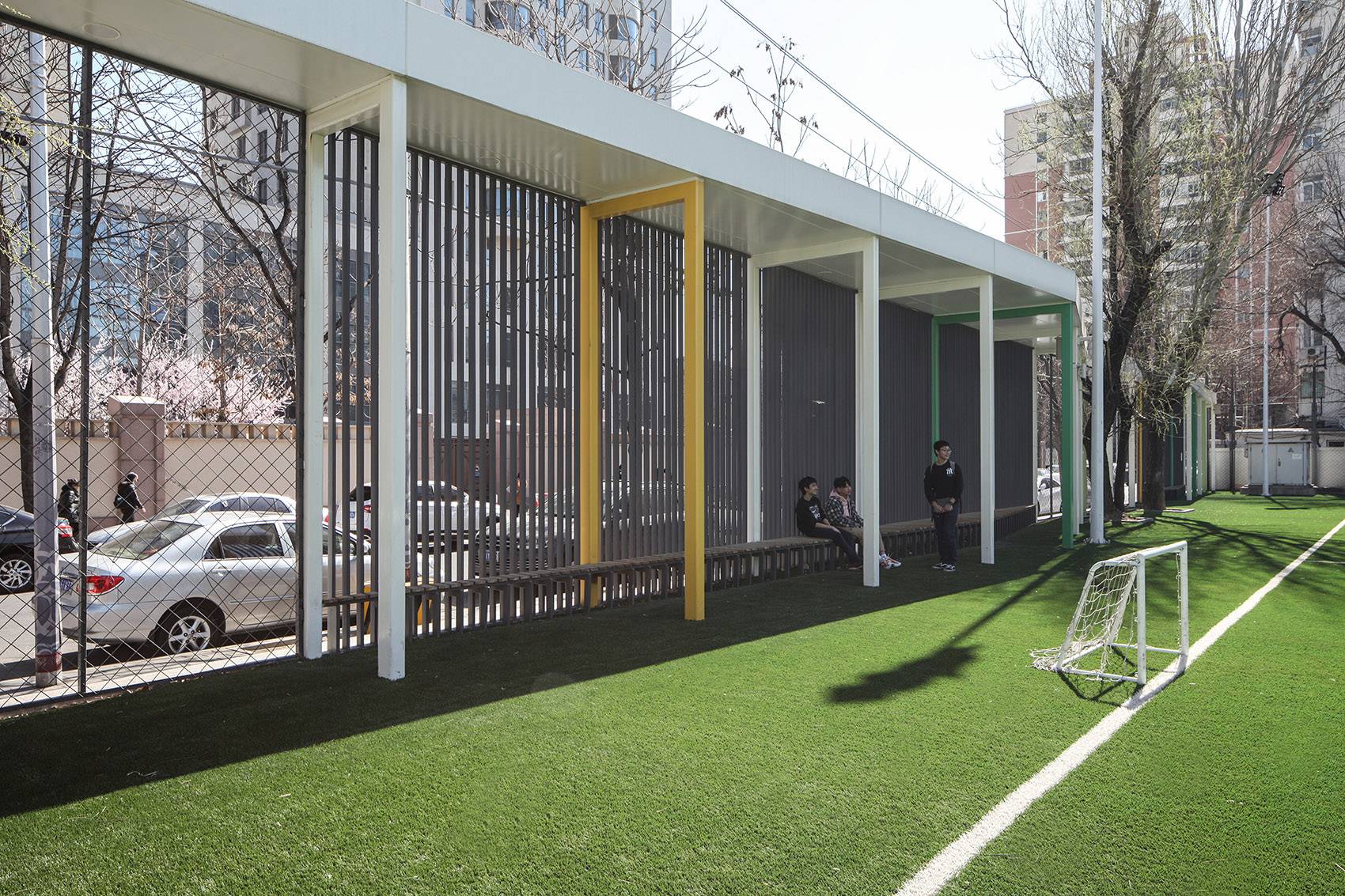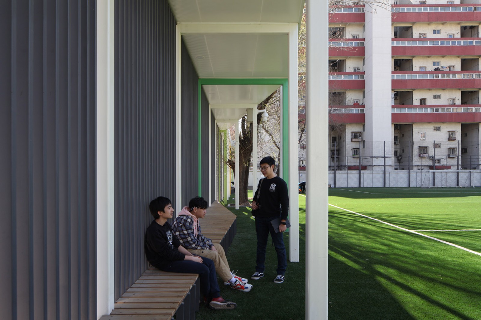 校園圍墻這類所謂“次要”元素往往不受重視,缺乏設(shè)計投入,成為極少與人產(chǎn)生互動的消極空間。但我們嘗試為它賦予一些積極功能。在朝陽未來學(xué)校的校園邊緣,我們沒有建起圍墻,取而代之的是一段內(nèi)置了屋頂和座椅、并最大程度增加了通透性的“游廊圍欄”。不僅為校園內(nèi)部人群提供了非正式社交空間,也強化著校區(qū)與社區(qū)的聯(lián)系,鼓勵學(xué)生接觸真實世界。