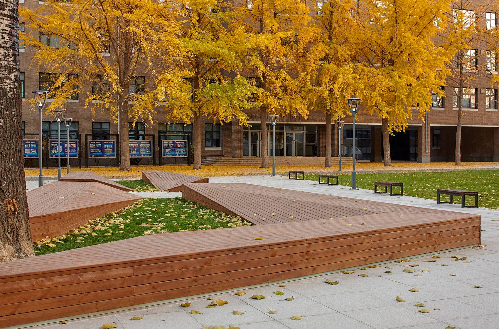校園核心區(qū)的大草坪雖然允許進(jìn)入,但大家不習(xí)慣直接坐在草上,也沒人愿意在這空蕩蕩的地方久留,就成為一處面積很大、利用率卻較低的場所。我們希望讓所有“看的綠化”都轉(zhuǎn)化為“人的空間”,就在草坪內(nèi)部及道旁樹周邊添加了各種戶外坐具,使之搖身一變成為“露天教室/客廳”,讓愜意的交流隨時隨地發(fā)生。