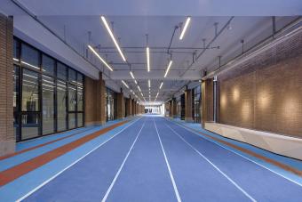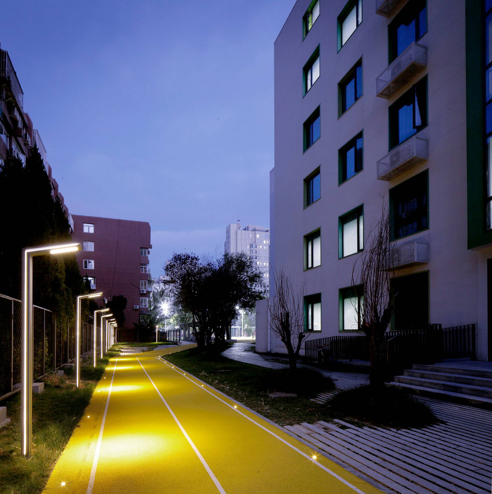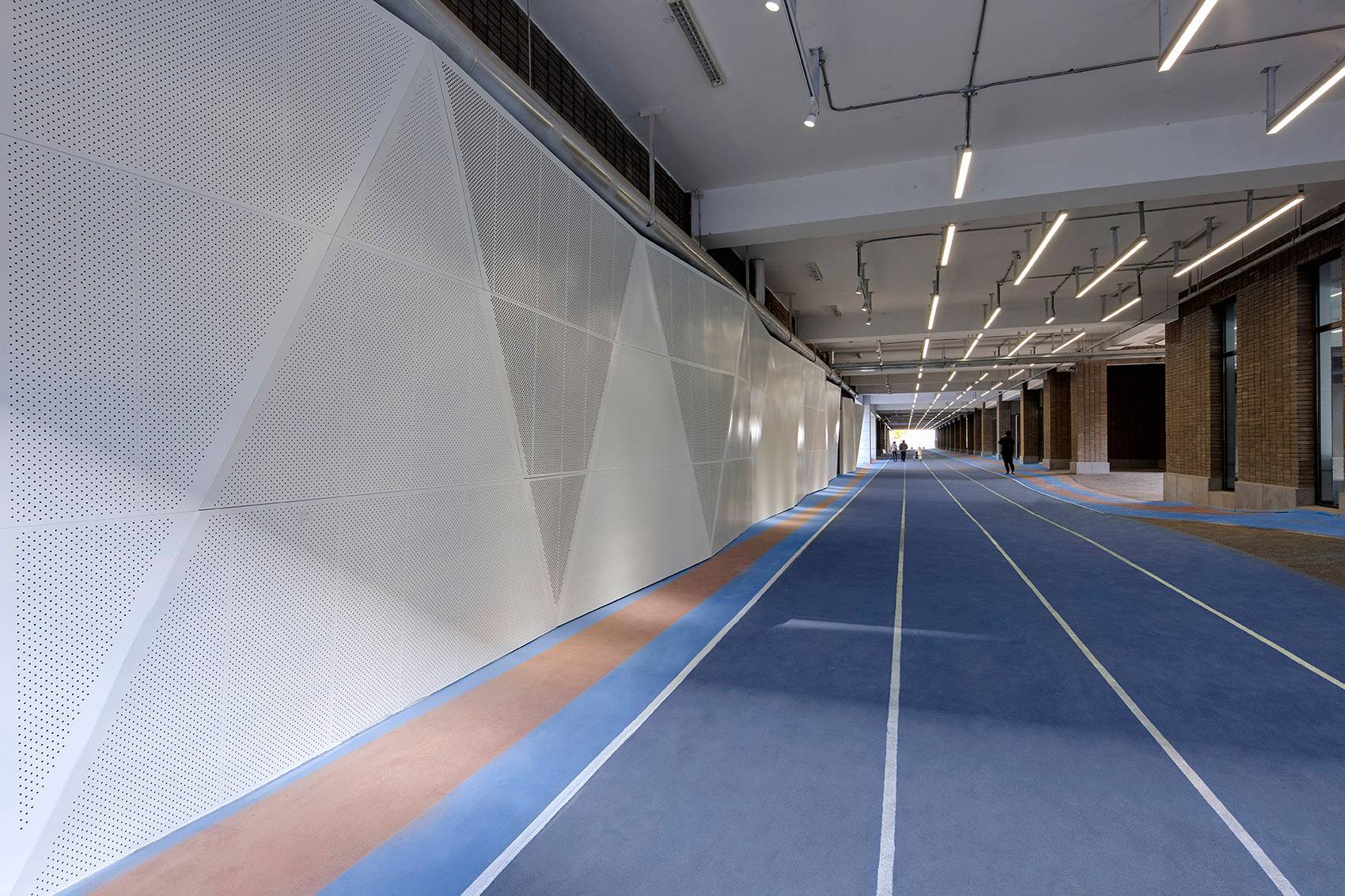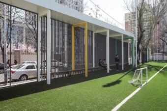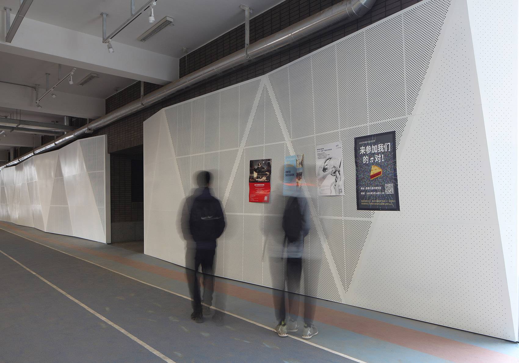 我們還在一條原先光線昏暗、功能模糊、利用低效的樓間消防通道,地面鋪設(shè)了跑道,墻體間嵌入功能件,升級為一處集跑道、休息區(qū)、宣傳欄于一體的復(fù)合功能空間。其中的百米跑道成為學(xué)校利用率最高的體育訓(xùn)練場地之一。