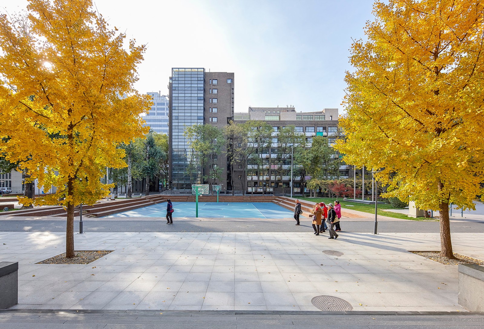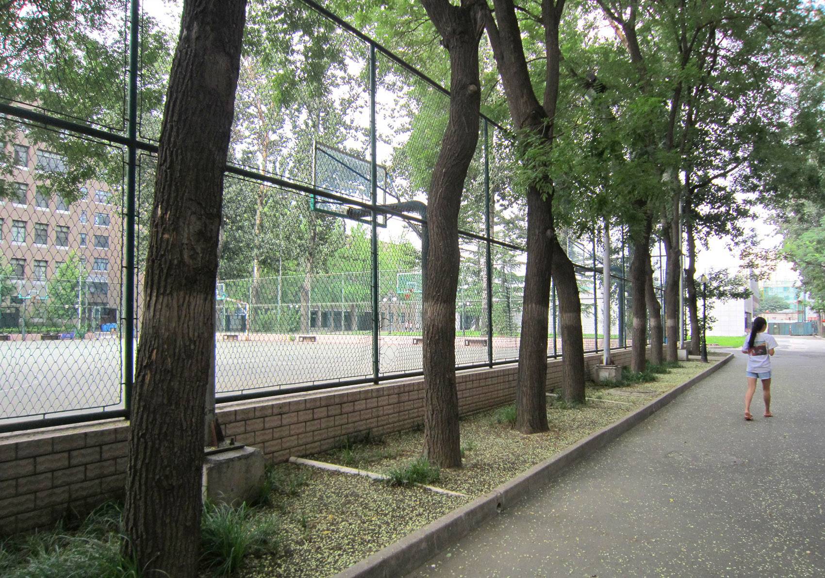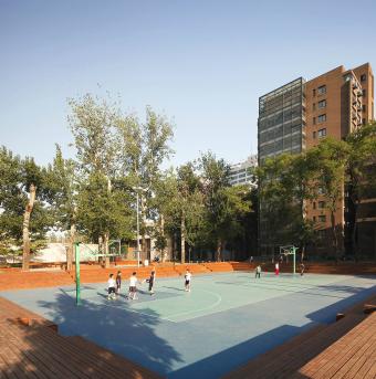 路的問題解決后,為將整個校園連綴成更完整的自由區(qū)域,我們又逐個優(yōu)化了若干空間封閉或功能單一的“孤島”。校園中央,原有一處四周高聳著鐵絲網(wǎng)的封閉籃球訓(xùn)練場。校方在向全校師生征求校園改造意見時,呼聲最高的一條就是“保留老球場”,因為那里承載了許多校友和在校生最美好的校園記憶:課間十分鐘也要沖下樓打會球,烈日下或大雪天都不在乎,切磋出的友誼,帥氣的中場三分、集體榮譽的巔峰、怦然心動的時刻……