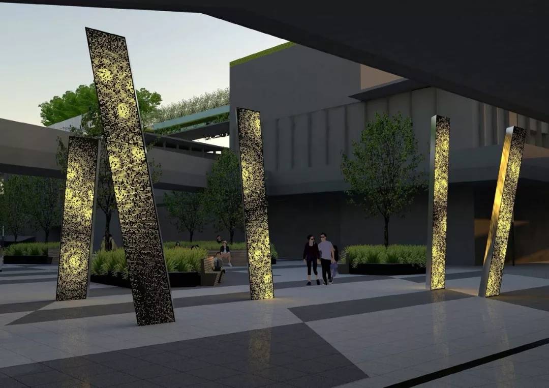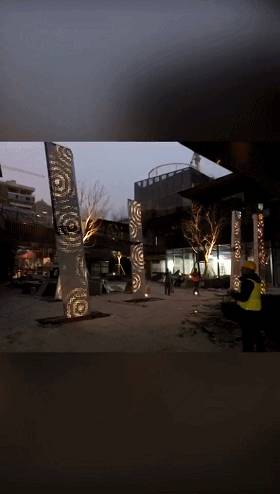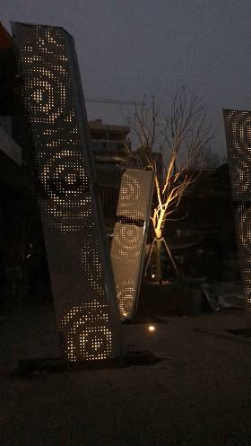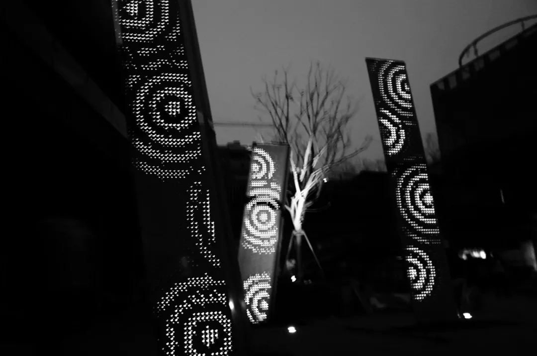 “鐘聲”互動裝置:材料:304鏡面不銹鋼板,鋼板,互動聲光程序;尺寸:4.9-6.2M高*5根。概念取材長安八景中的“雁塔晨鐘”,以高清鏡面不銹鋼板做外飾面,內置人體感應元件,當人在裝置群組中穿行時會觸發(fā)裝置內部感應系統(tǒng),晨鐘遂而響起,同時伴隨著多種效果的LED燈光互動,以此增強場地的趣味性。