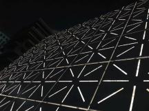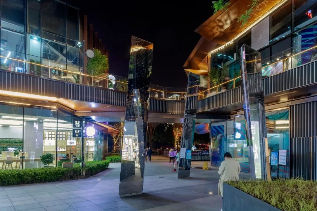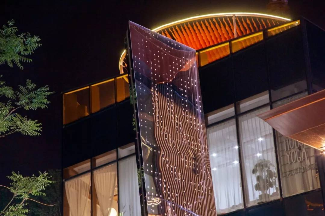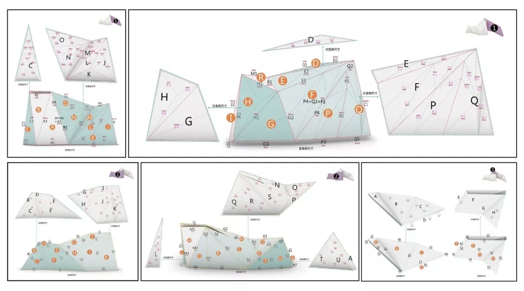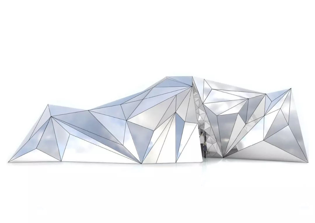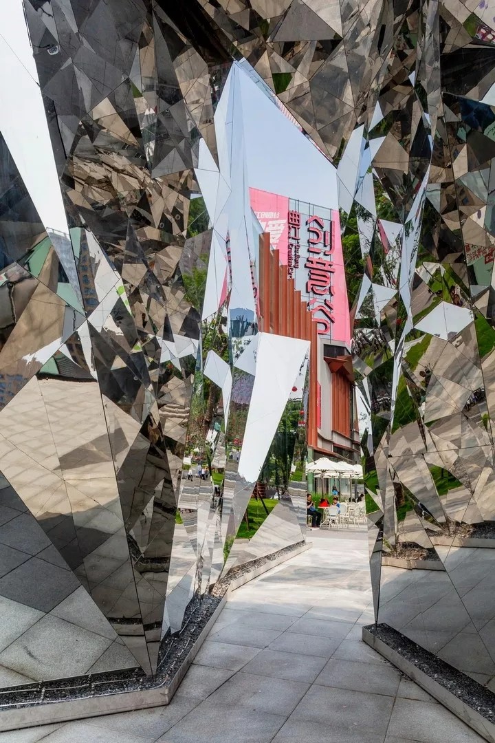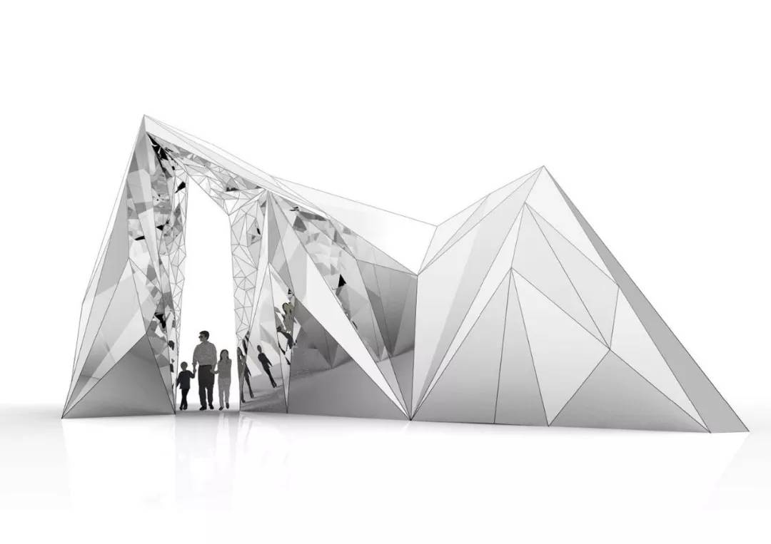 “華岳”鏡面裝置:材料:鏡面復合板;尺寸:19M*6M高。源于“華岳仙掌”,裝置以通體鏡面效果的轉折造型對其進行演繹,作為此處藝術節(jié)點裝置。白天多角度造型的鏡面設計往往因為難以捉摸的反射效果,帶給參與者奇特的空間感受;夜幕降臨,地面星星燈經鏡面山體的多重反射,成倍出現在頂面,宛如夜間由星空搭起的廊架。