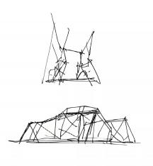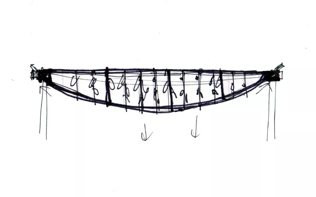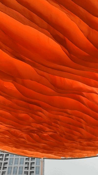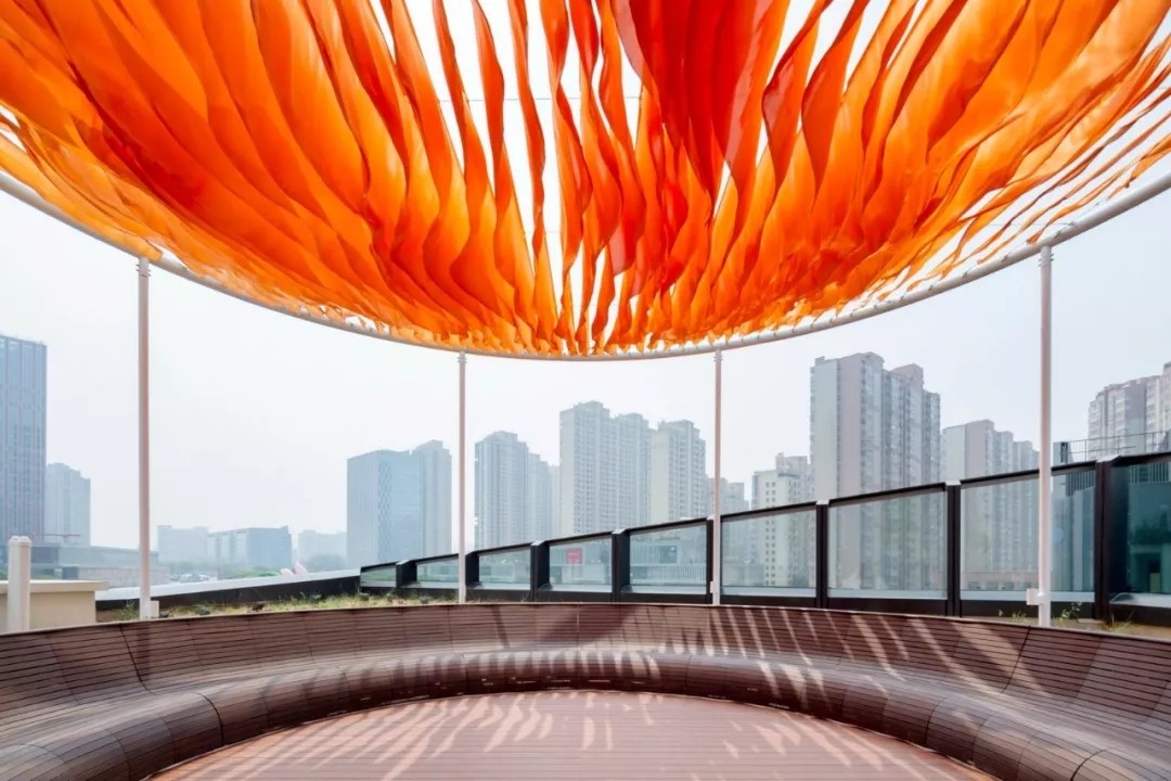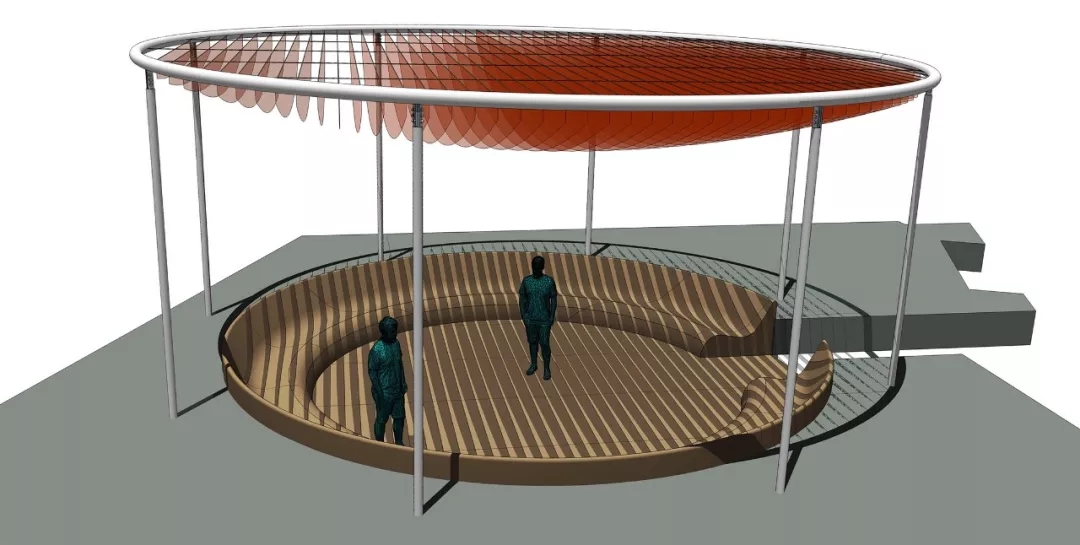 “風柳”亭:材料:鋼管,316不銹鋼絲,布料;尺寸:直徑10M*5M高。源于“灞柳風雪”,裝置以此景提取“風”元素作為出發(fā)點,打造為頂部為軟質布條的藝術廊架。喧鬧的都市,有這么一處地方,你安心的坐著,忽然抬頭發(fā)現,風,原來是看得見的。