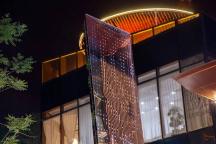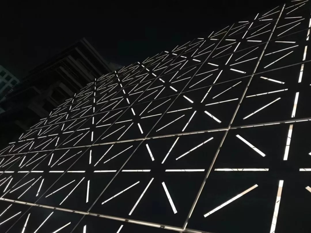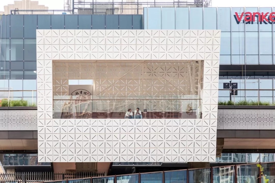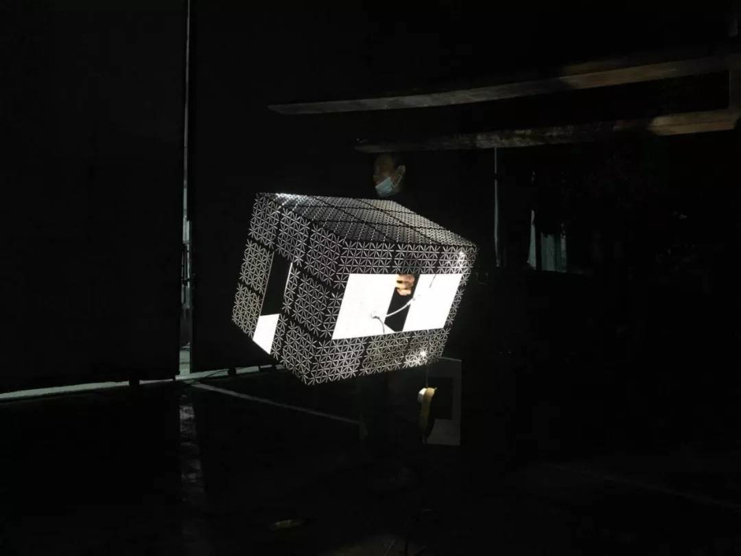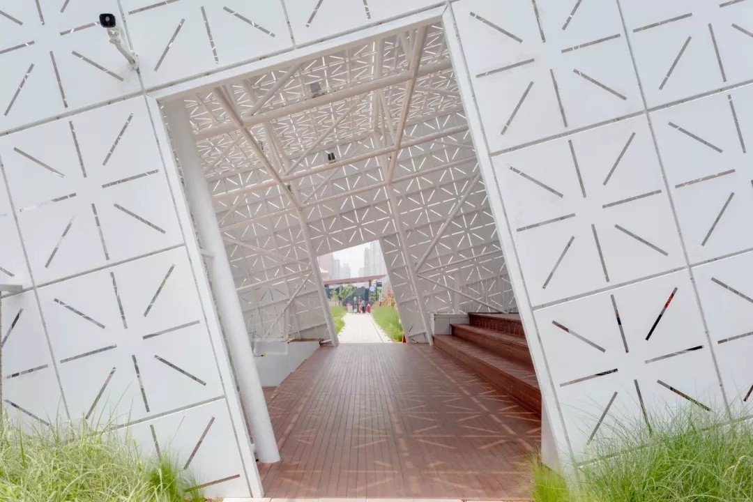 “積雪”觀景亭:材料:鋼管,鋁板;尺寸:12M*9M*9M。源于“太白積雪”,大體量傾斜于廊架橋的方盒子,因為通體白色,簡練的雪花鏤空飾面顯得簡潔輕快,宛如一個輕盈的雪盒子。時逢假日,潔凈的雪盒子又因為絢爛的燈光效果令場所熱鬧非凡。進入盒子內部,視角因屋頂的傾角設計和大框景,變成一處獨特的觀景空間,亦或是一個舞臺,每個人,都可以是那個俯瞰全場的人。
