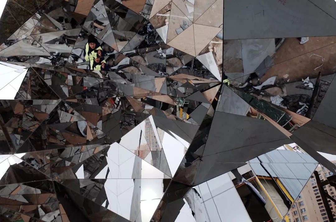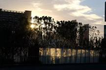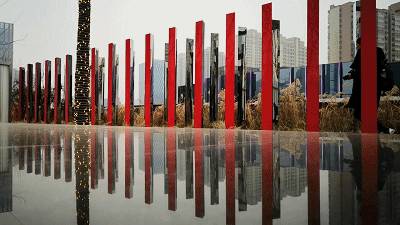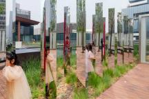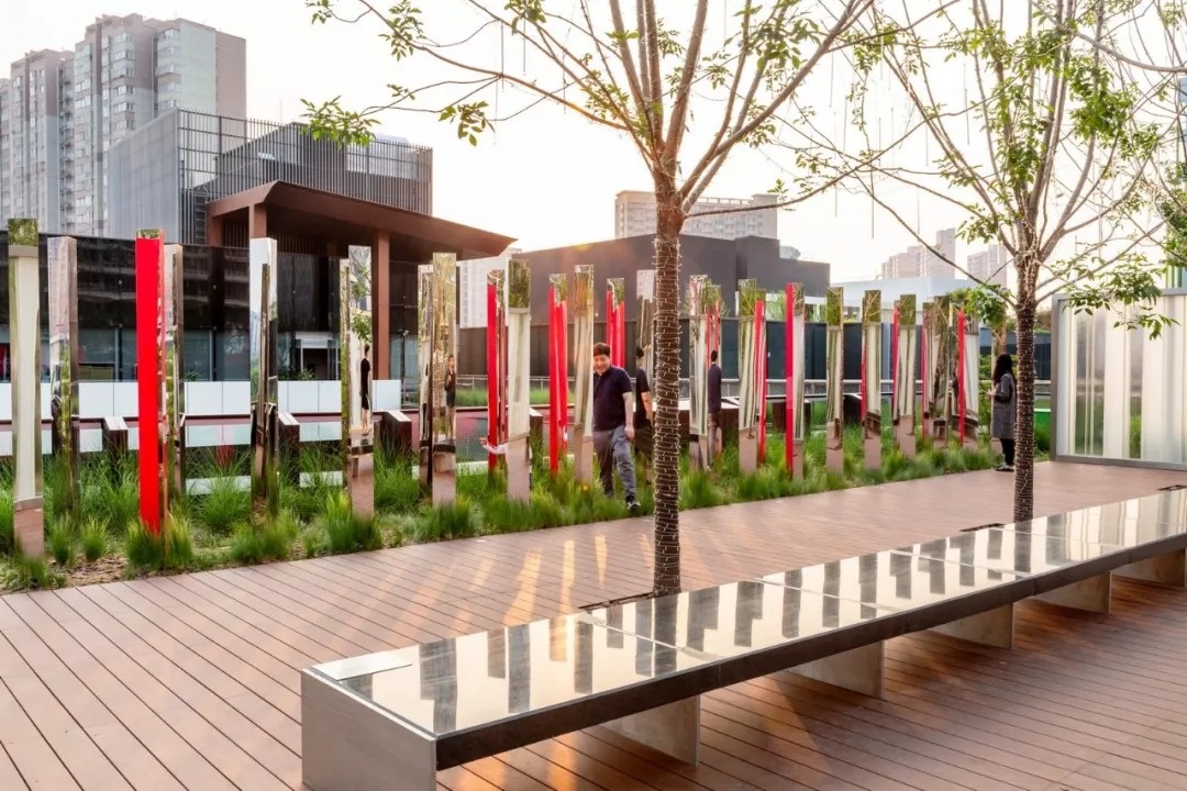 “晚照”互動裝置:材料:304鏡面不銹鋼板;尺寸:2.5M高*43根。源于“驪山晚照”, 43根鏡面三角管,雙排設計,相互反射出多層次景觀。面西而坐的觀景人,看到的不僅僅是夕陽西下,而是觀者自身、周圍景色與漫天霞光融為一體。