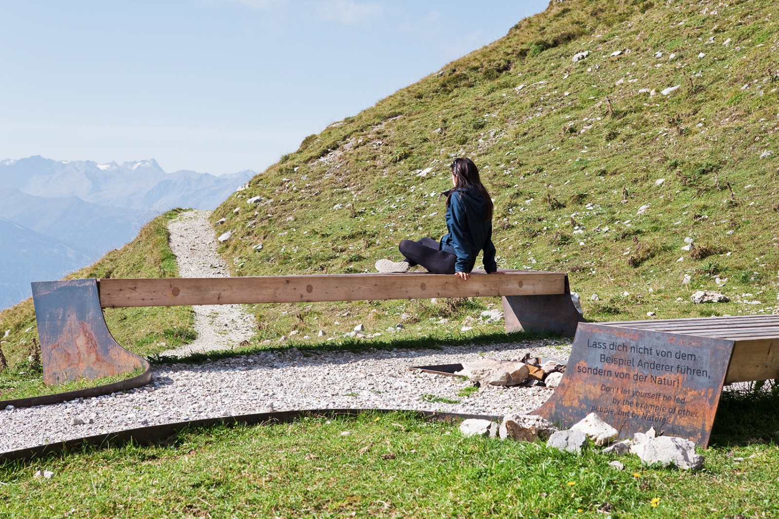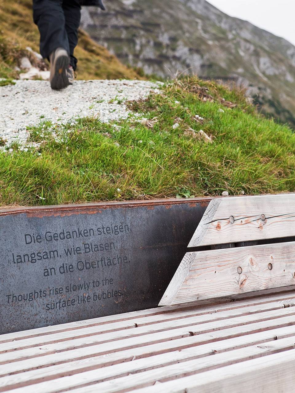 觀景步道將山上既有的耐候鋼制的雪崩防護結(jié)構(gòu)重新利用。新增結(jié)構(gòu)也均以耐候鋼作為材料,完美地融入周圍環(huán)境中。平臺和斜靠臺選擇山上盛產(chǎn)的落葉松木材作為材料。奧地利哲學(xué)家路德維?!ぞS特根斯坦(Ludwig Wittgenstein)的名言被雕刻鋼結(jié)構(gòu)上,使游客在欣賞外部風(fēng)景的同時,對自己進行內(nèi)在反思,為觀景步道賦予了雙重意義。