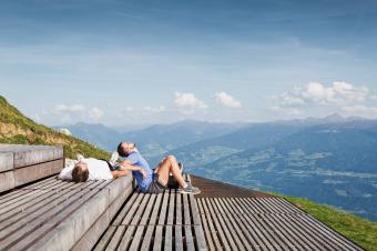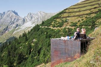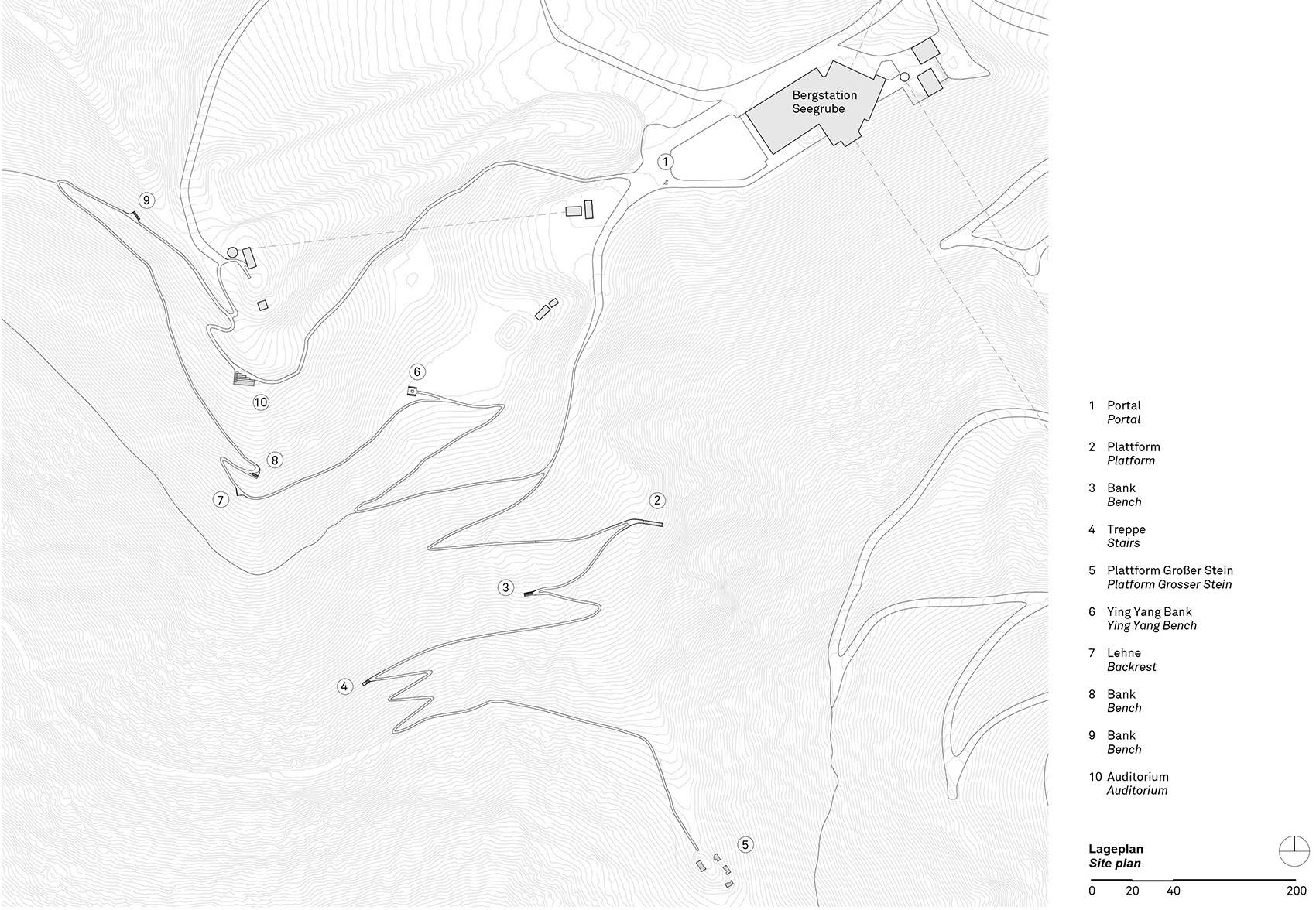 懸挑于山體的觀景臺猶如從地形中優(yōu)雅地生長出來,突顯出地形的原有特點。游客在平臺上可以將山下客棧及其周圍景色盡收眼底,平臺底部的金屬格柵營造出一種漂浮于云端的感覺。位于植被帶交界的一系列階梯結(jié)構(gòu)將山上奇妙的自然景觀突顯出來。步道沿線的斜靠臺可供登山者??啃菹?,同時欣賞Langer Sattel和Frau Hitt山峰的景色。一系列被稱作“Big Stone”的木質(zhì)平臺被設(shè)置在山體的不同高度,抬升于地面的結(jié)構(gòu)成為了游客們最喜歡的休息場所。在海拔更高的地方則設(shè)有階梯式休息平臺,帶給游客劇場般的獨特感受。