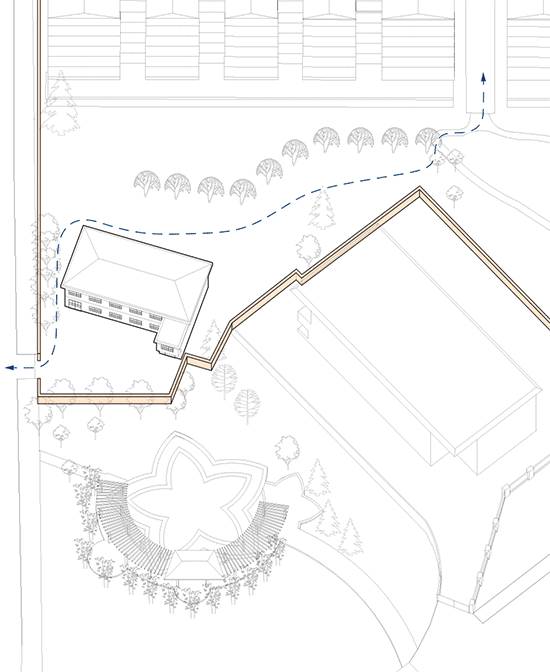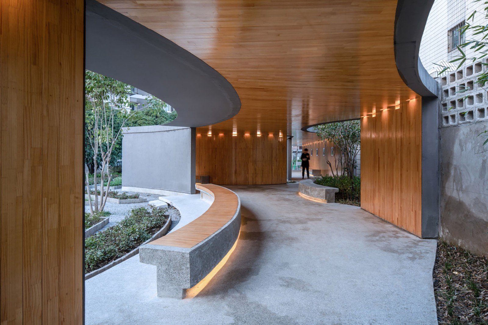 改造中將一條線(xiàn)性的異形曲廊置入場(chǎng)地,異形曲廊作為圖底關(guān)系反轉(zhuǎn)而形成的負(fù)形空間,一方面調(diào)整并重新界定了社區(qū)的邊界以及居民回家的路徑;另一方面,完形并凸顯了原本松散隔離的幾片活動(dòng)場(chǎng)地,并將居民回家的動(dòng)線(xiàn)引入其中。