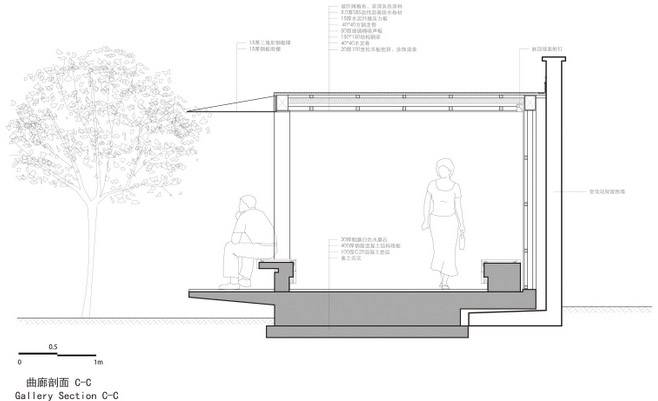 ▼作為框景的曲廊,曲廊邊上設(shè)有木制臺(tái)面的休息空間? 田方方