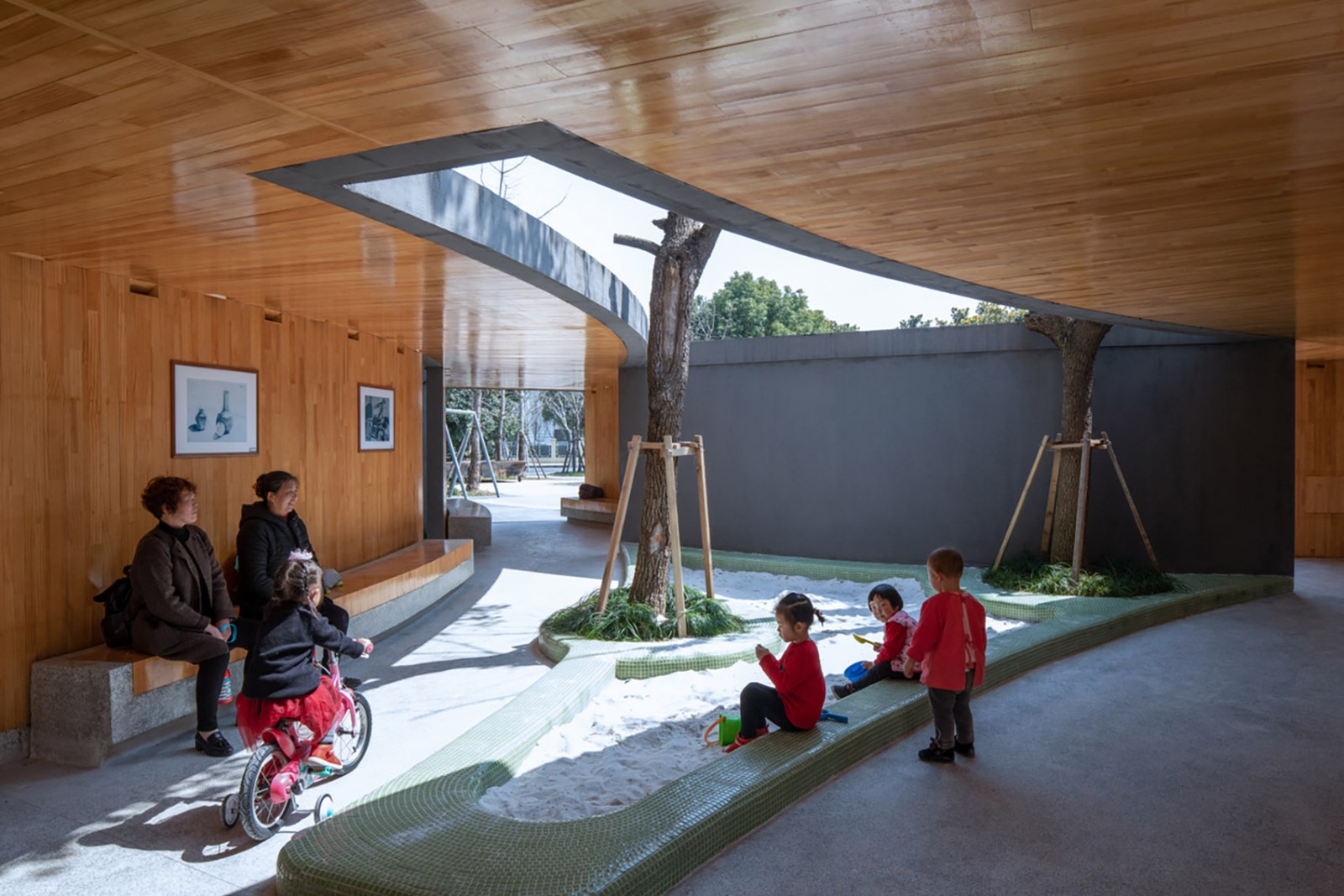 ▼更新后的社區(qū)入口(左),曲廊局部,節(jié)點(diǎn)處的沙坑成為孩子們最?lèi)?ài)的玩耍處(右)? 田方方