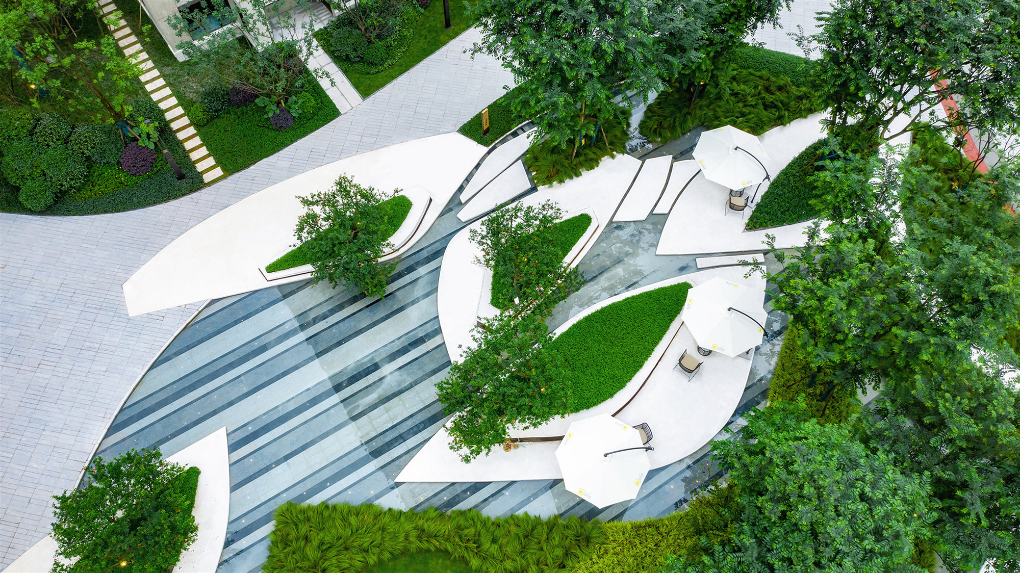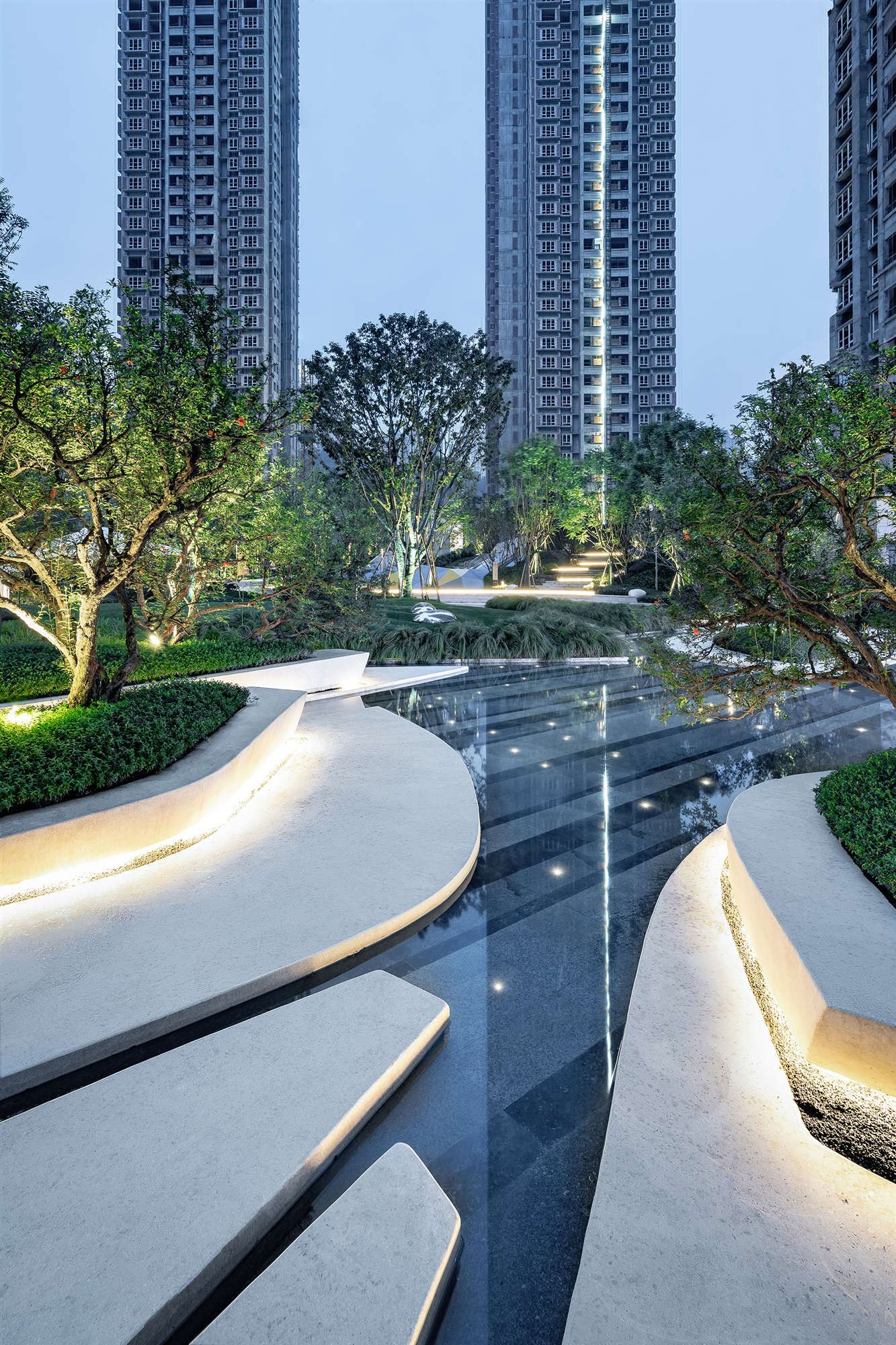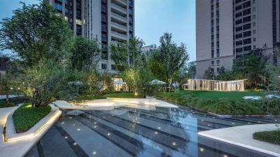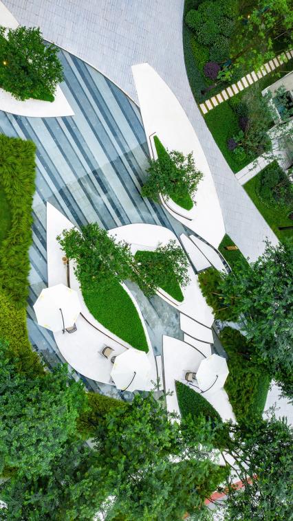 映入眼簾的是以抽象“舟”與“島”為設(shè)計靈感的花溪島畔。與花池緊密咬合的溪川水景,中庭婉轉(zhuǎn)的陽光草坪,蜿蜒起伏的路徑重構(gòu)出綠色自然的空間秩序。水景被切割成曲折而富有線條感,形成一座“山川舟島”,賦予了水的靈動。穿梭其中,曲水環(huán)繞,形成曲徑通幽的回家之路。看似簡單的造型,設(shè)計師們卻討論了許多次,精雕細(xì)琢每一個形態(tài)與線條,每一處銳度與弧度。