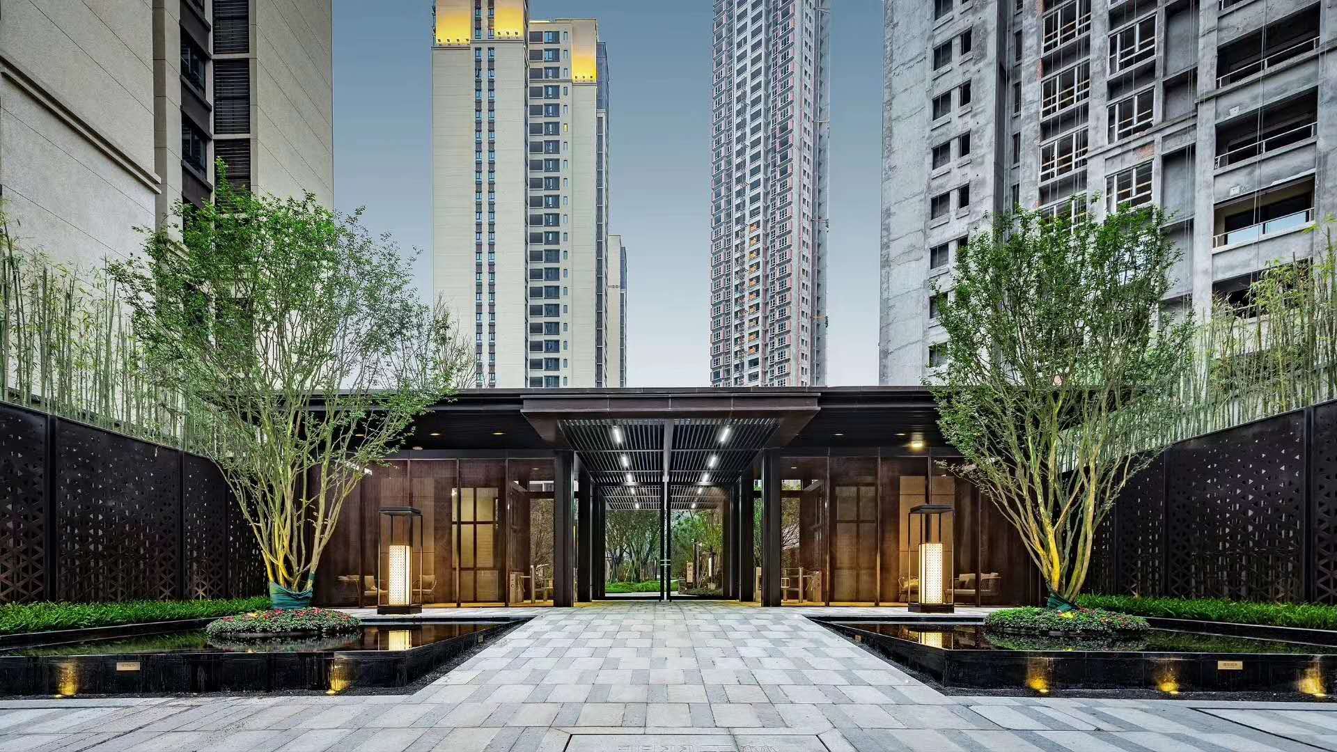 入口端莊優(yōu)雅,不失溫馨。水景與風(fēng)雨橋,塑造了回家的儀式感,給予了業(yè)主尊崇與端莊的體驗,布置軟座與茶座,擴(kuò)展入口功能,提供人性化等候區(qū)。